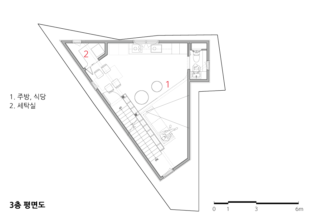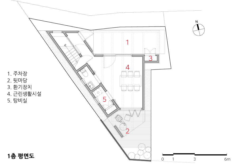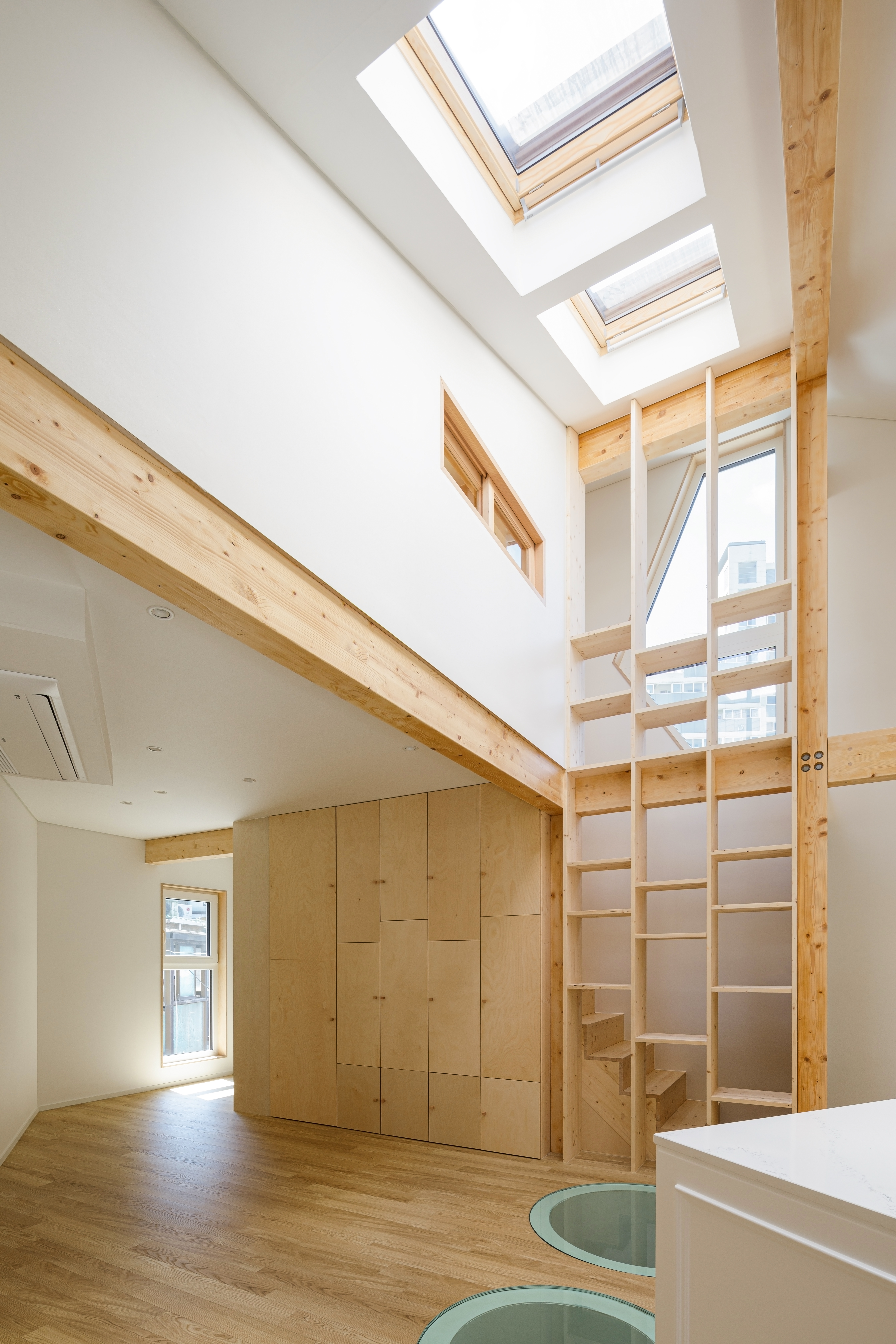 Structure _ This house has designed heavy timber structure. The house built on a narrow triangular site in Jung-gu, Seoul has no views to see from the front like any other narrow houses and is surrounded by neighboring houses on all sides. In the city center that leads to narrow alleys, it is most important to build a house quickly. The construction period was shortened by using a prefabricated heavy timber construction for the entire structure. The timber construction has the effect of making the wall thin, so it is also effective for space utilization. In addition, it is characterized by economical use of space since the end of the building is treated with column-less cantilever to secure one parking space for a house. In the case of timber construction, this cantilever structure causes deflection, which makes buildings prone to deformation in the long run. To prevent this, structural calculation-based engineered wood was used to solve structural deflection.