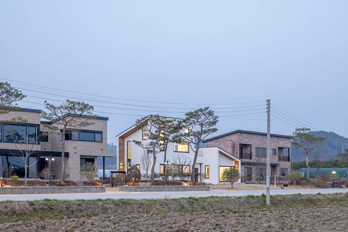본 건축물의 대지는 과거 논이었던 공간을 개발하여 도로와 4개의 필지로 만들었고 그중 중간에 위치한 한 필지였다. 전면에 위치한 도로를 제외하고 사이트의 전면과 후면으로 농지가 펼쳐져 있는 평야와 같은 곳에 대지는 조용히 자리 잡고 있었다. 사방이 트여있는 이곳에 어떤 건축물을 앉혀야 좋을까라는 고민으로 계획은 시작되었다. 농지를 면한 대지는 4계절의 변화에 민감하다. 봄이 되면 다시 생명을 품기 위한 준비를 하고, 여름에는 초록빛으로 물든 바람에 나부끼는 넓은 초록바다가 펼쳐지고, 가을에는 황금빛으로 물들고, 겨울이 되면 수확이 끝난 공허한 평야가 펼쳐지고 가끔 새하얀 세상이 되기도 한다. 이곳에 복잡한 형태의 건물보다는 단순하지만 개성이 있는 집을 그려봐야겠다는 마음이 들었다. 단순하지만 가로로 놓인 사각형 매스와 세로로 놓인 사각형 매스 2개를 결합한 형태로 건축물의 형태는 결정되었다. 대지의 뒤쪽으로 넓은 농지와 멋진 산이 보이는 곳이어서, 뒷마당을 활용할 수 있도록 계획한 것은 어쩌면 당연한 결과였던 것 같다.