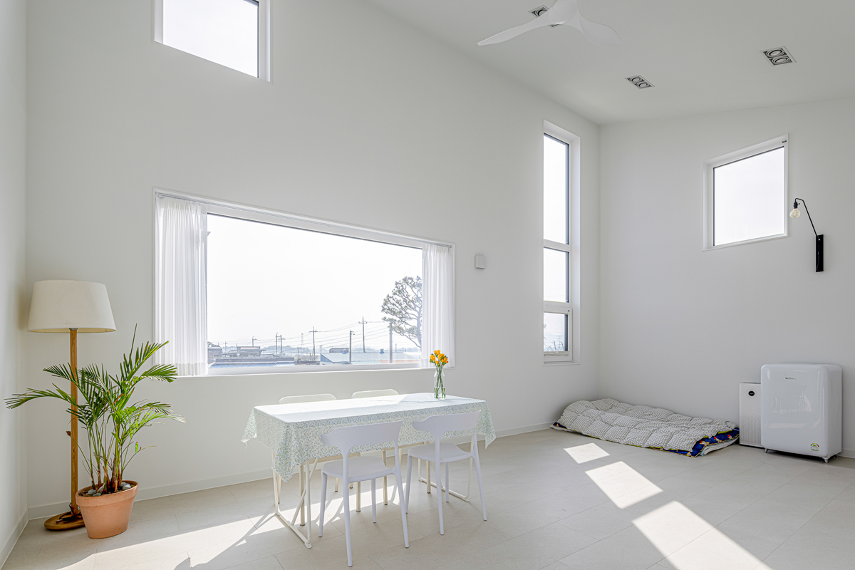 With the ceiling that utilizes the slope as it is to bring the slope into indoor space, the exterior of the house with the shed roof was designed to create an impression of space for flat spaces which may look rather plain. Almost all spaces are colored in white consistently. Although white color is most commonly used and universal, it is possible to feel the change in saturation depending on the shape and the amount of light entering through the change of windows. It can also make a space look wider. The space like white drawing paper is not flashy, but it is being completed with the client's good sense, such as using lighting, furniture, and flower pots.