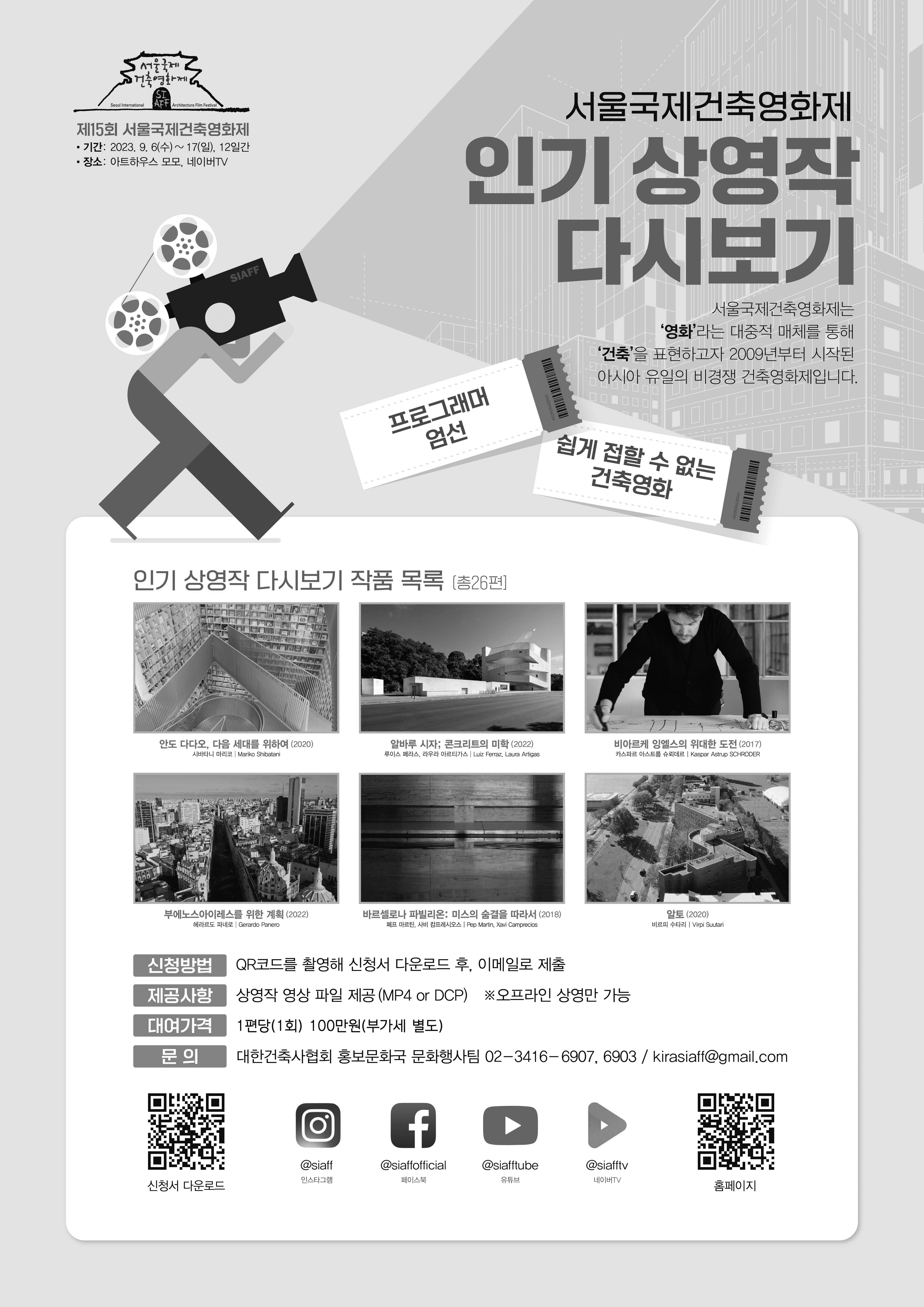 대한건축사협회는 “평소 쉽게 접할 수 없는 건축영화의 재관람을 희망하는 관객들의 성원에 힘입어 ‘인기 상영작 다시보기’를 진행한다”고 밝혔다. 다시보기는 담당 프로그래머가 직점 엄선한 총 26편의 작품으로 구성됐다. 안도 다다오, 알바루 시자 등 다양한 아키텍트의 비하인드를 담은 영화의 다시보기를 연중 상시 신청 가능하다. 자세한 사항은 대한건축사협회 누리집 공지사항을 확인하거나, 대한건축사협회 문화행사팀(kirasiaff@gmail.com, 02-3416-6907, 6903)으로 문의하면 된다. 한편, 서울국제건축영화제는 영화라는 대중적 매체를 통해 건축을 표현하는 문화예술 행사로, 종합예술이라는 장르로 하나되는 건축과 영화의 문화적 만남을 통해 건축의 가치를 조명하고자 2009년부터 시작된 아시아 유일의 비경쟁 건축영화제다.