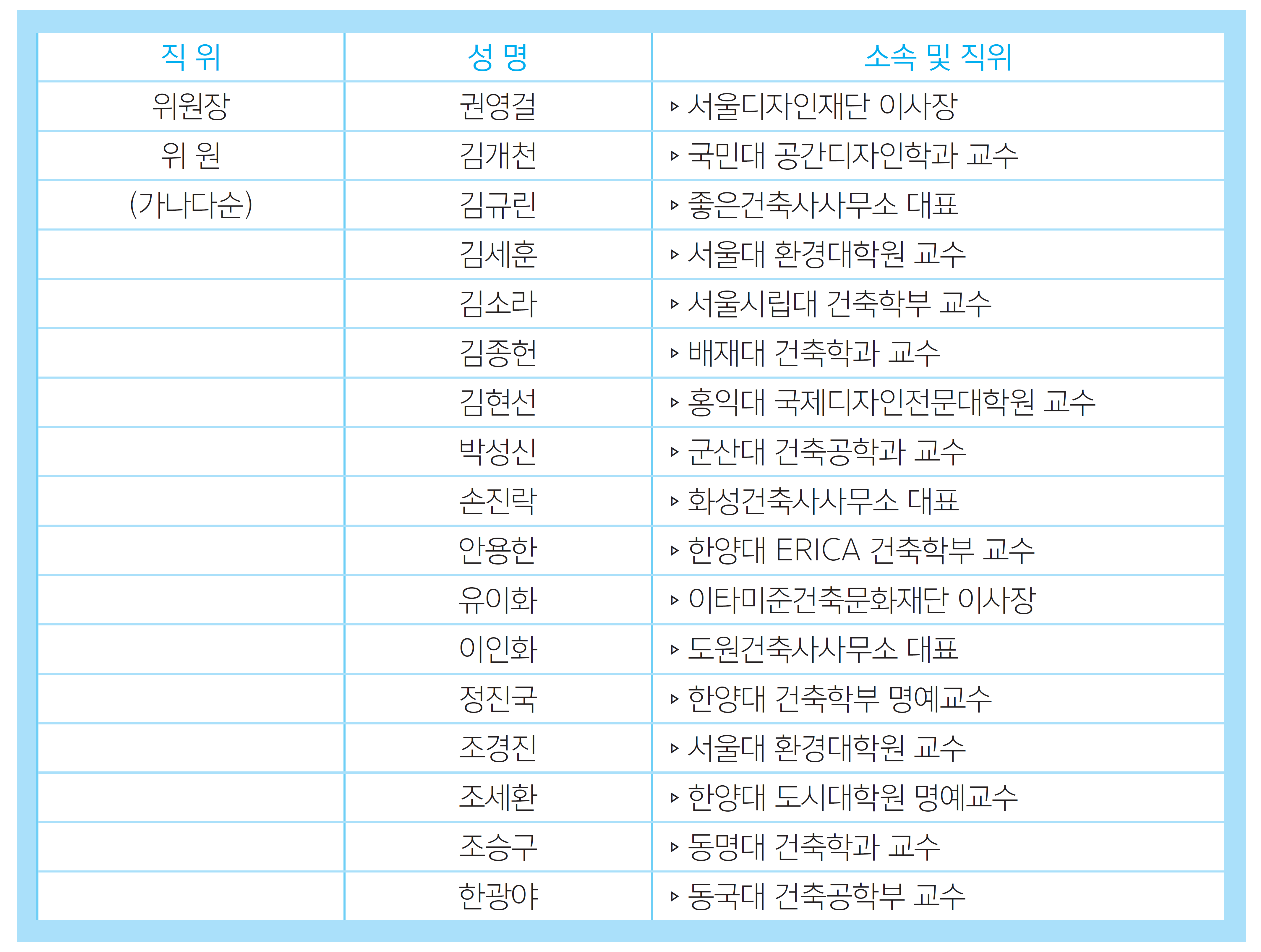신임 권영걸 위원장은 “국민의 삶을 담을 새로운 미래공간을 위한 건축·도시환경 정책을 적극 개발하고, 국가를 상징하는 대표적인 도시공간을 국민과 소통하며, 해당 부처 및 유관기관과 긴밀히 협의해 수행하겠다”라고 밝혔다.