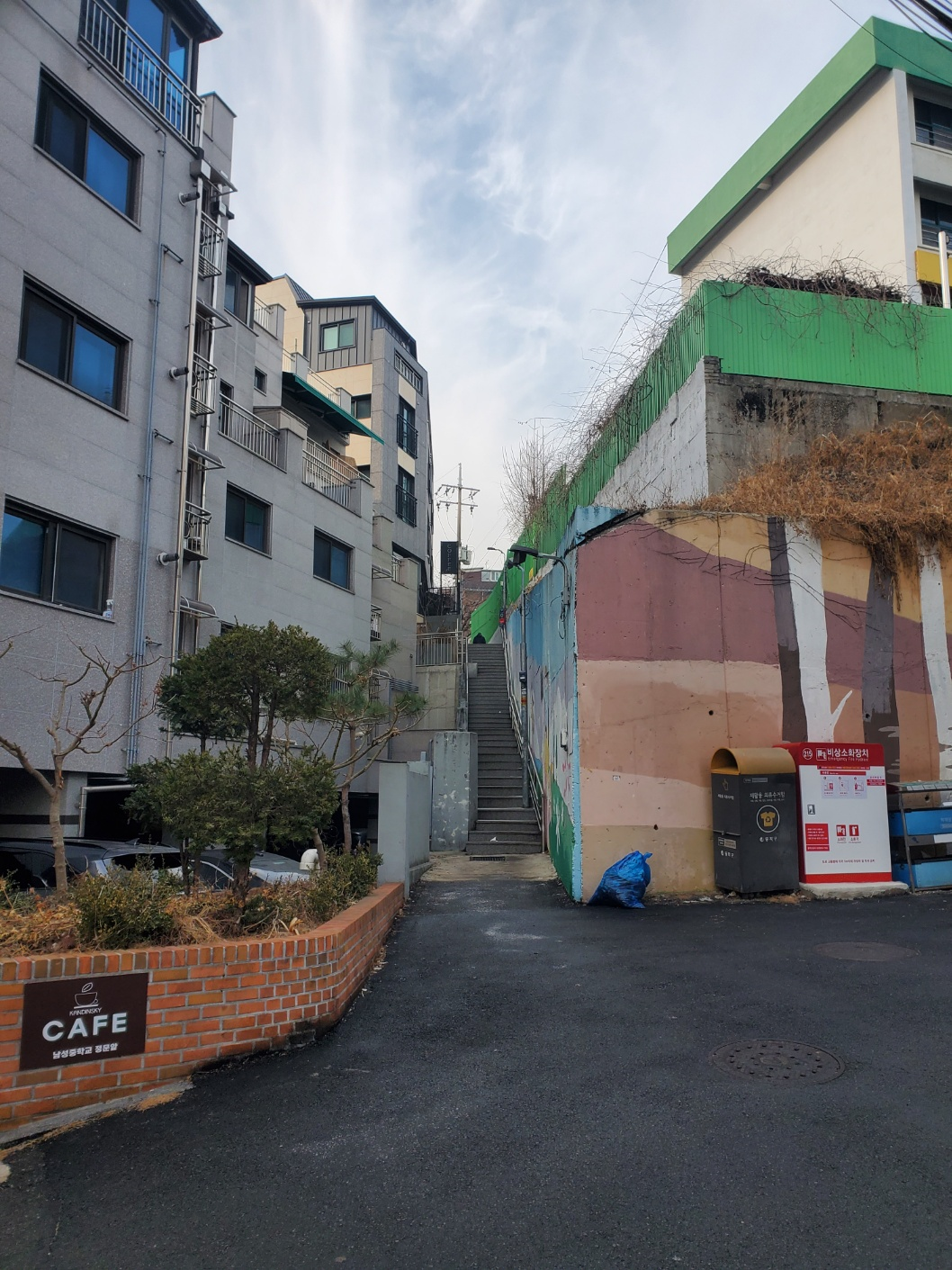 골목을 걷다가 작은 틈새를 마주쳤다. 지번과 지번이 만나는 그 사이를 비집고 들어선 작은 틈새길, 이곳에 좁고 긴 계단이 생겼다. 대부분의 일반적 삶의 잣대가 쉽고 편한 대로로 가려는 것이 인지상정인데, 좁고 경사진 저 계단으로 가려는 사람이 몇이나 될까? 골목을 응시하며 잠시 기다려 본다. 좁은 길을 찾는 자는 드물기에 오르다가 내리다가 힘들면 기대고 쉬어갔으면 좋겠다. 비뚤어지고 불규칙한 계단 길 그리고 높은 옹벽이 더욱 위압감을 자아낸다. 도시의 팽창과 압축 속에서 자리한 자투리 공간, 이 공간은 누군가의 퇴근길이며 누군가 출근길, 일상의 필요한 지름길일 것이다. 좁은 계단 양옆으로 마주하는 자세가 서로 대비를 이룬다. 높은 옹벽으로 차단할 수 있고, 기댈 수 있으며, 벽화가 그려진 캔버스가 되기도 한다. 맞은 편 경사지며 올라가는 각각의 대지와 건축물은 좁은 계단과 연결되며 중간중간 참으로 연결된다. 서로 다르게 조우하는 방식의 차이로 인해 골목계단은 지루하지 않으며 다채로워진다.
