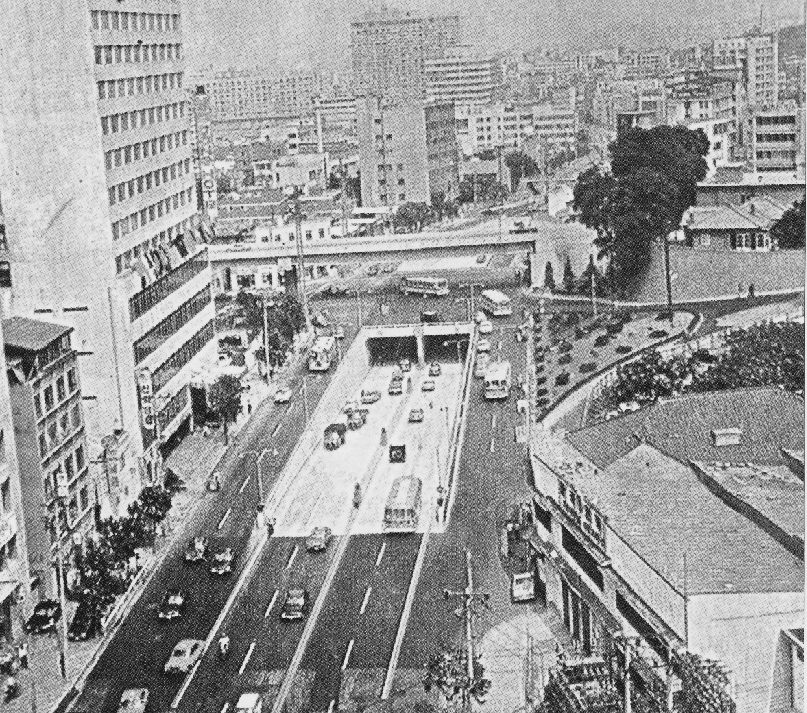 도시인프라 한국전쟁 이후 도시 재건~경제개발기 동안 서울은 팽창된 도시 영역을 하나의 도시로 네트워크화 하고, 중요하게 고려되는 장소들의 효율적인 연결을 위해 ‘속도’가 보장되는 다양한 도시 인프라를 조성했다. 이 시기 도시의 상징은 ‘발전’ 이라는 가치를 드러내는 요소였으며, 발전의 기준은 수많은 자동차가 달릴 수 있는 지상의 넓은 도로, 고가도로 또는 지하터널과 같은 방해 받지 않고 이동이 가능한 복층 도로, 도시의 생산성에 기여하는 많은 사람을 동시에 이동시킬 수 있는 지하철 노선의 건설 등이었다. 3개의 터널을 통해 내사산을 뚫고 외사산까지 진행된 서울의 도시화지역 확대 및 지금 서울 모습의 뼈대를 완성한 데에 토목공사의 역할이 있었다고 할 수 있다.