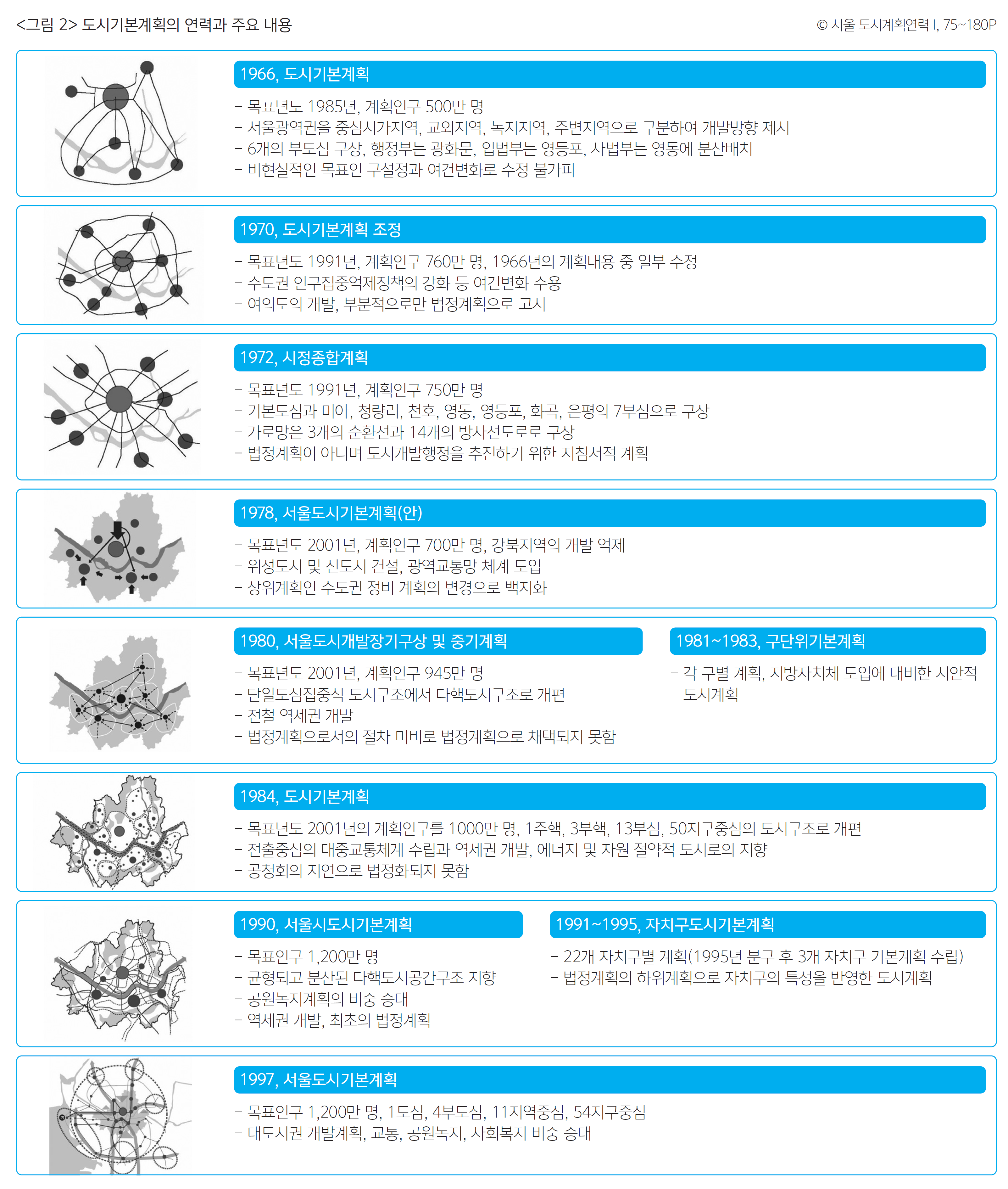 관련 법, 제도의 제정과 계획들 서울은 1952년 단핵 4부 도심의 도시재건계획 수립을 시작으로, 1962년 시작되어 제5차 경제개발계획까지 경제개발계획과 함께 1966년 건축법 제정, 1972년 국토개발법, 주택건설촉진법, 1980년 택지개발촉진법등 정부의 관련 법 제정에 따라 도시기본계획을 수립하고, 주택 및 인프라 건설을 위한 각종 개발사업을 추진한다. 서울의 도시기본계획은 폭발적으로 증가하는 인구에 맞추어 도시화 지역을 확대하고, 증가한 인구에 맞는 도시기본계획을 지속적으로 재수립해야 했다.