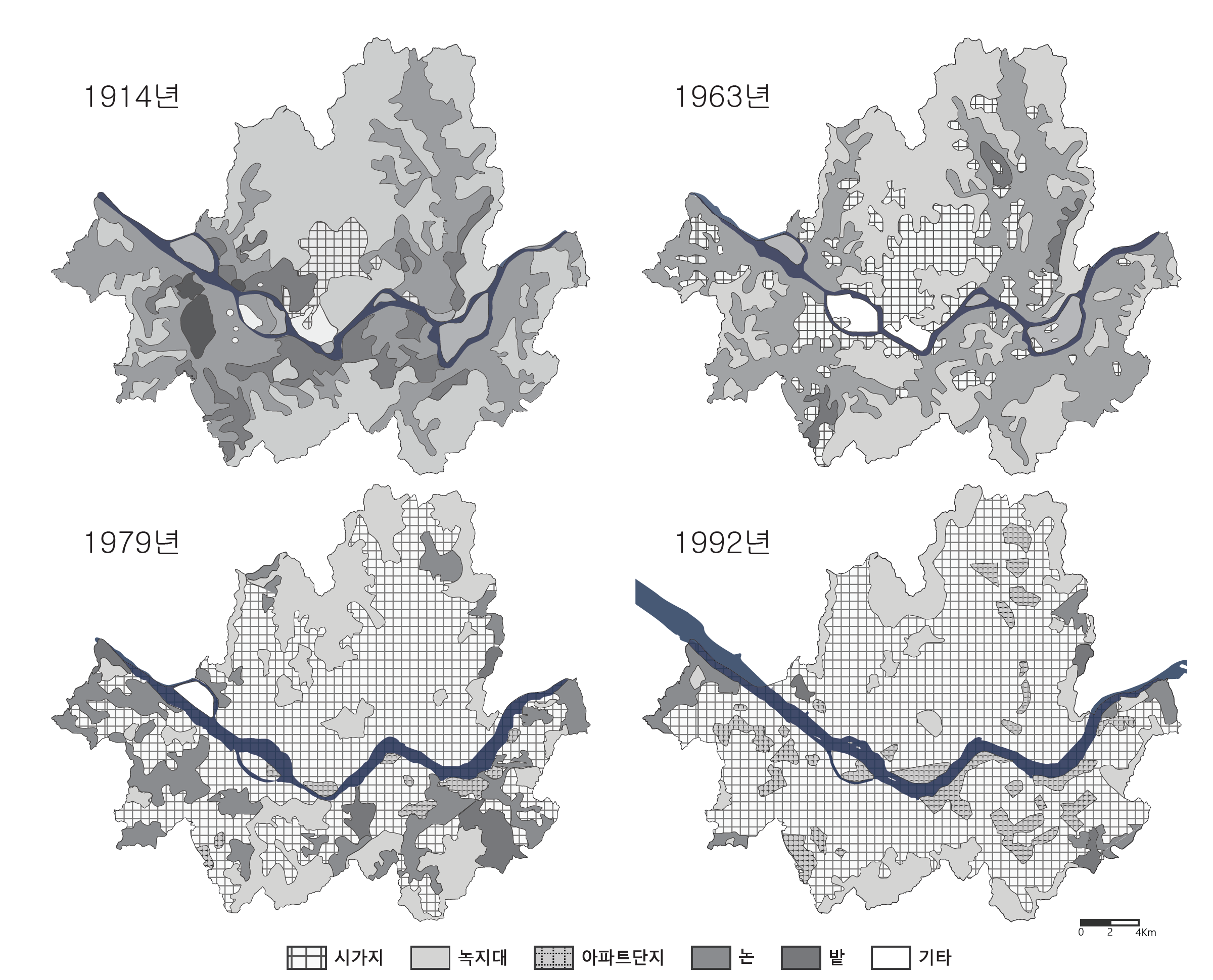 도시 영역의 양분화 확장된 서울 도시화지역의 대부분은 1970년대부터 개발된 한강 이남에 해당한다. 이러한 도시 영역의 확장으로 이전 도시의 경계 역할을 하던 내사산, 한강과 같은 입지선정 시 도시 요소의 의미 또는 역할은 변경되었고, 서울은 이 시기에 한강의 남쪽지역과 북쪽지역으로 양분화되었다. 강남을 향해 퍼져나가 외사산에서 멈춘 팽창과 변화의 원심력은 ‘도시 내 균형발전을 위해’ 다시 도시 안으로 돌아오는 구심력으로 작용하며 역사도심 지역도 변화시켰다.