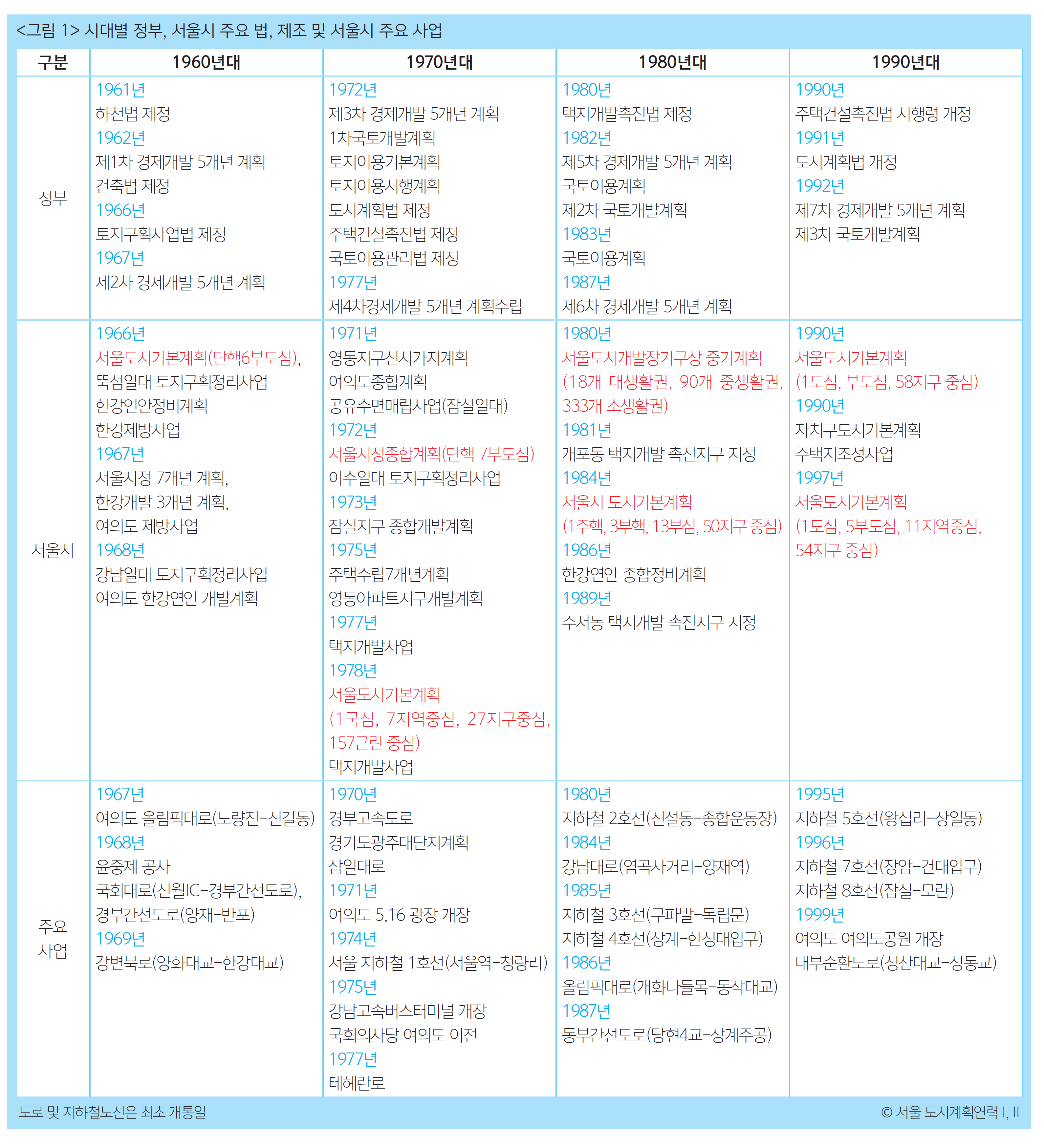 관련 법, 제도의 제정과 계획들 서울은 1952년 단핵 4부 도심의 도시재건계획 수립을 시작으로, 1962년 시작되어 제5차 경제개발계획까지 경제개발계획과 함께 1966년 건축법 제정, 1972년 국토개발법, 주택건설촉진법, 1980년 택지개발촉진법등 정부의 관련 법 제정에 따라 도시기본계획을 수립하고, 주택 및 인프라 건설을 위한 각종 개발사업을 추진한다. 서울의 도시기본계획은 폭발적으로 증가하는 인구에 맞추어 도시화 지역을 확대하고, 증가한 인구에 맞는 도시기본계획을 지속적으로 재수립해야 했다.