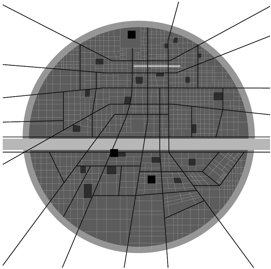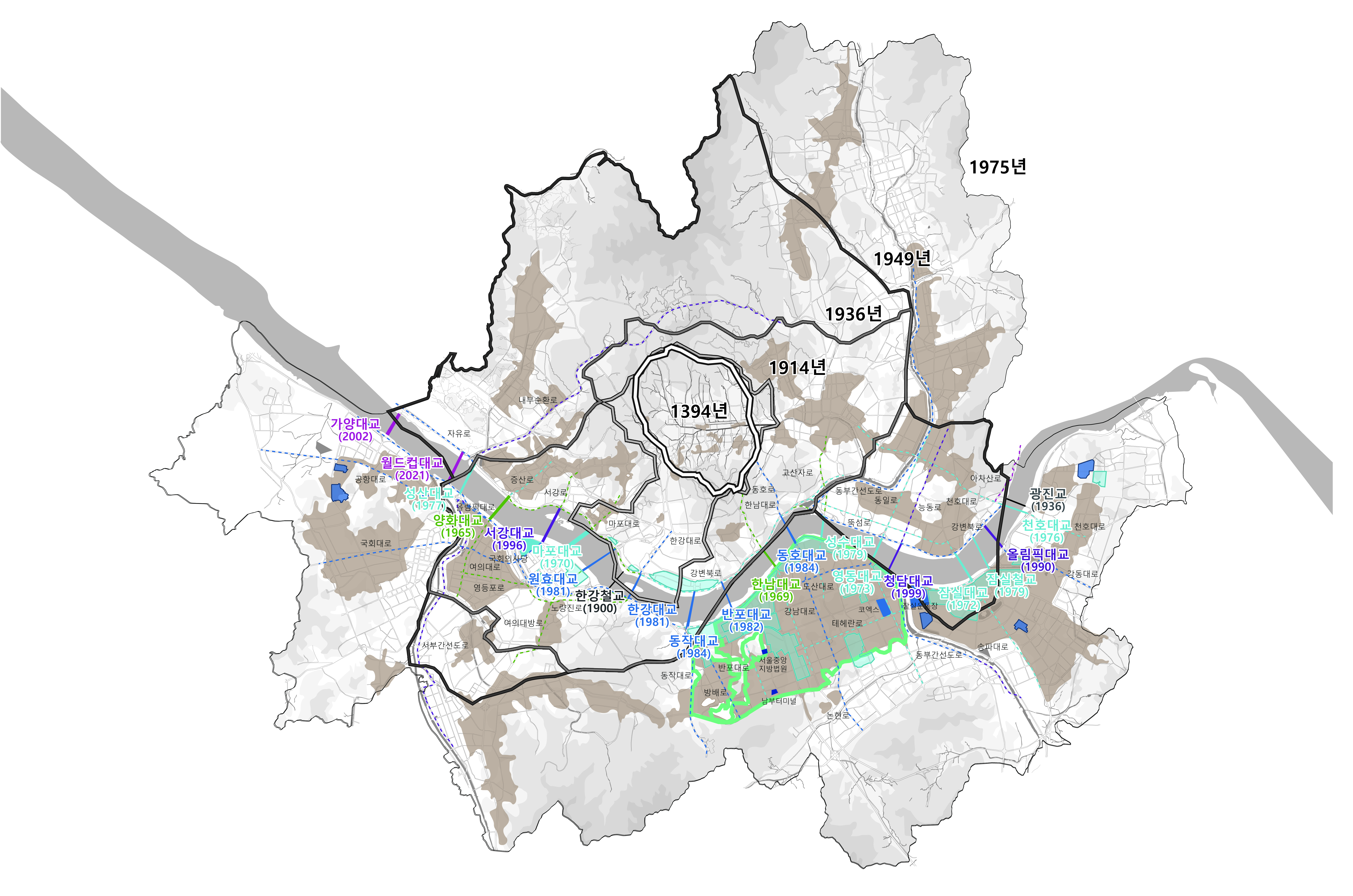 도시 영역의 양분화 확장된 서울 도시화지역의 대부분은 1970년대부터 개발된 한강 이남에 해당한다. 이러한 도시 영역의 확장으로 이전 도시의 경계 역할을 하던 내사산, 한강과 같은 입지선정 시 도시 요소의 의미 또는 역할은 변경되었고, 서울은 이 시기에 한강의 남쪽지역과 북쪽지역으로 양분화되었다. 강남을 향해 퍼져나가 외사산에서 멈춘 팽창과 변화의 원심력은 ‘도시 내 균형발전을 위해’ 다시 도시 안으로 돌아오는 구심력으로 작용하며 역사도심 지역도 변화시켰다.