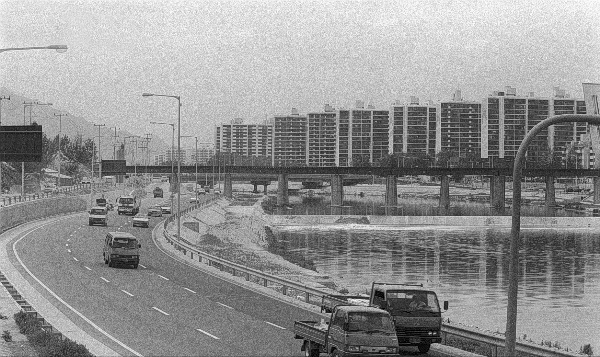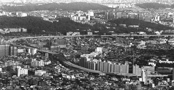 도시인프라 한국전쟁 이후 도시 재건~경제개발기 동안 서울은 팽창된 도시 영역을 하나의 도시로 네트워크화 하고, 중요하게 고려되는 장소들의 효율적인 연결을 위해 ‘속도’가 보장되는 다양한 도시 인프라를 조성했다. 이 시기 도시의 상징은 ‘발전’ 이라는 가치를 드러내는 요소였으며, 발전의 기준은 수많은 자동차가 달릴 수 있는 지상의 넓은 도로, 고가도로 또는 지하터널과 같은 방해 받지 않고 이동이 가능한 복층 도로, 도시의 생산성에 기여하는 많은 사람을 동시에 이동시킬 수 있는 지하철 노선의 건설 등이었다. 3개의 터널을 통해 내사산을 뚫고 외사산까지 진행된 서울의 도시화지역 확대 및 지금 서울 모습의 뼈대를 완성한 데에 토목공사의 역할이 있었다고 할 수 있다.