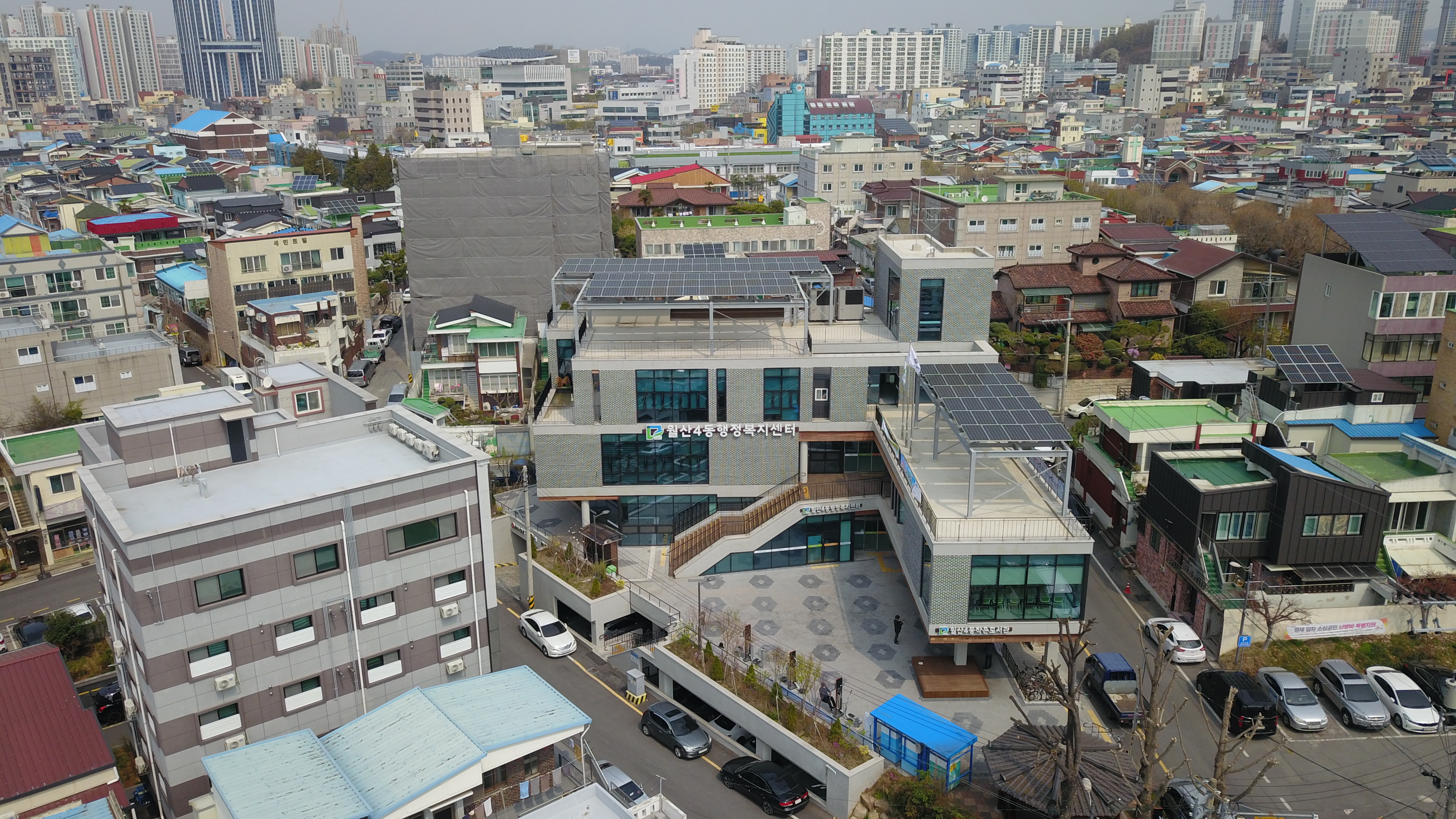 Reflecting the memories of the residents who used the existing site, the lower space of a pilotitype small library accessible from each road is visually connected to the existing pavilion. It is a visual passage where the landscape is intersected with the city beyond the street, and it is intended to be a place to contain everyday life of residents, such as resting and chatting. Through the separated masses and the emptied spaces, various outdoor spaces were constructed on each floor. The rooftop was designed to have solar panels in terms of design by making the steel structure a space for the installation of new renewable energy facilities in public architecture and to serve as a rooftop yard for people's activities by securing sufficient height at the lower part. The urban landscape borrowed from the space has expanded openness in contrast to the cramped village environment. We hope that this place will be a great place for the residents to communicate.