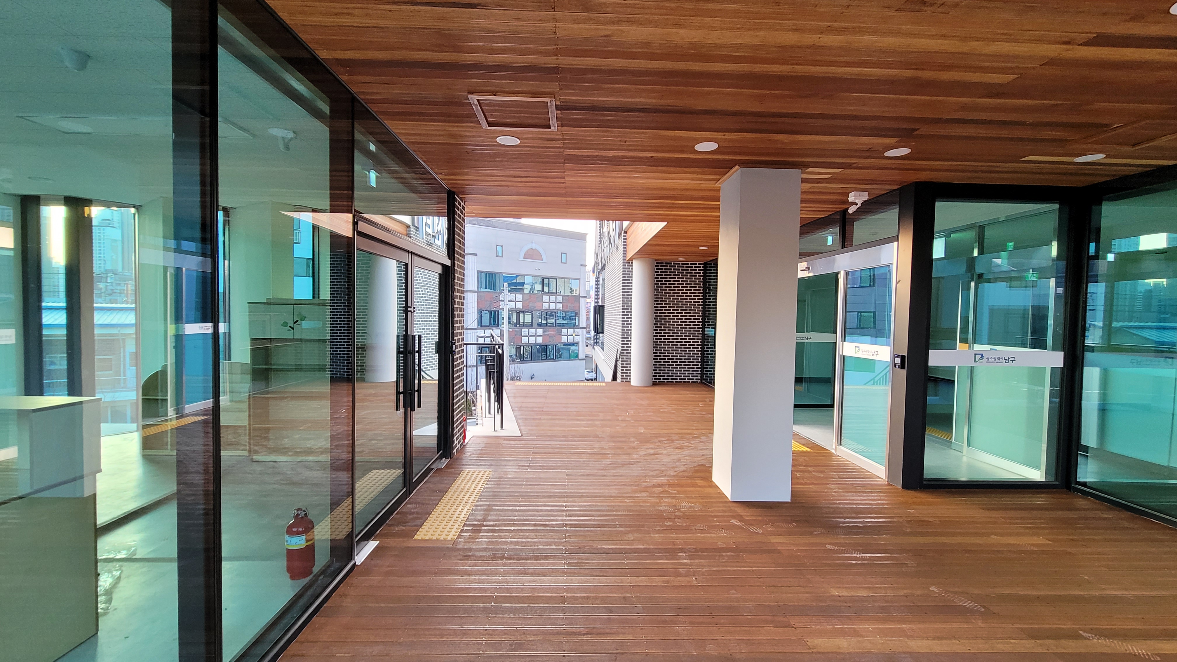 When we talk while looking at the building, we say ‘it looks like a government office’. This may mean that the uniqueness and locality of the land are excluded from the superficial form that is a requirement for public buildings. Most of the land needed to be excavated for construction of the underground parking lot, and a new space and form of construction completely changed the physical environment of the existing site. Under this circumstance, we tried to avoid using disparate materials including metal finishes, and for exterior we applied such materials as masonry, stone, and glass we can easily see in old residential areas. In addition, timber was used on the finish for an exterior ceiling to alleviate the possible hard and cold image. In this way, a new building ㅣ in a scale and form that can be compelling among existing small houses, and a continuity of materials shared with existing buildings allowed it to blend into the landscape of the town. At the same time, emptied space and irregularly designed glass windows reacted to the landscape so as to give a differentiated image of 'publicness'.