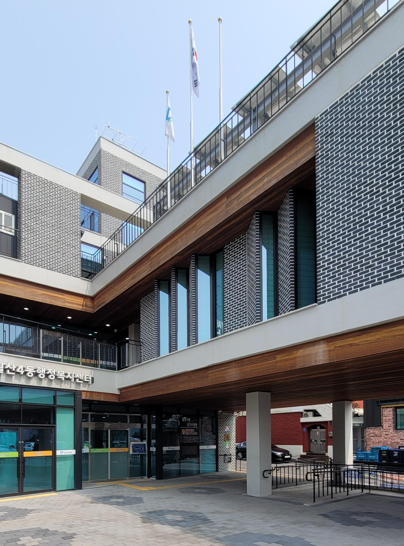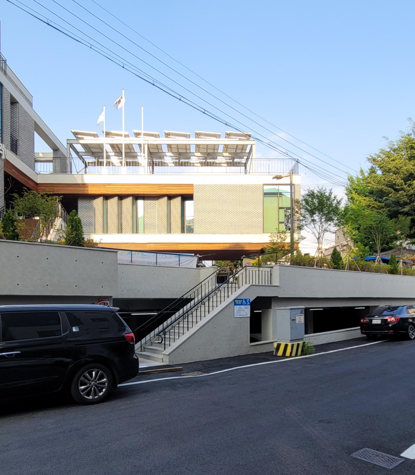 The site is a small triangular plot of land located in an old residential area. Setting aside many humanistic stories of the old town located in the city, the client's request for program that creates a small underground parking lot on this small triangular site, and the three roads with a height difference of up to 2m, going up and down without direction have led to an architectural approach of functions. The length of the ramp was minimized by installing the parking lot entrance at the lowest level of the road, and various access routes were formed to keep the flow and memory of existing walking that runs through the site on each road. The first floor was designed to be void to play the role of a yard for a variety of activities, and to maximize the residentriendly nature of an administrative welfare center. The layout of the building was planned in an ‘ㄱ’ shape starting from the most perpendicular part of the triangular site, by taking into account the south-facing environmental characteristics and constructability depending on the form.