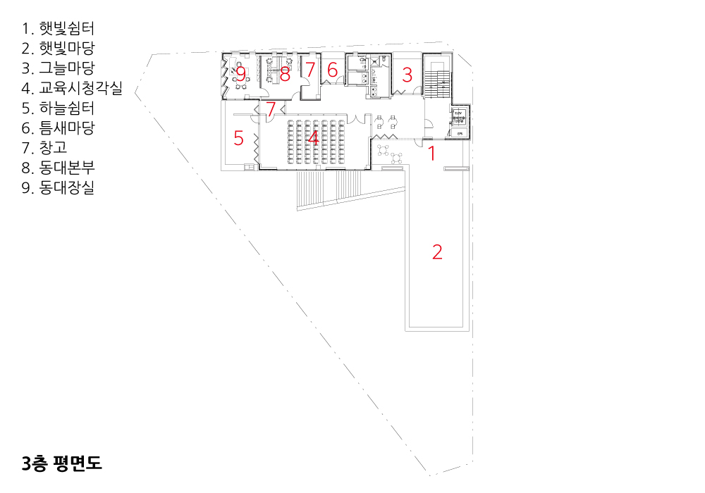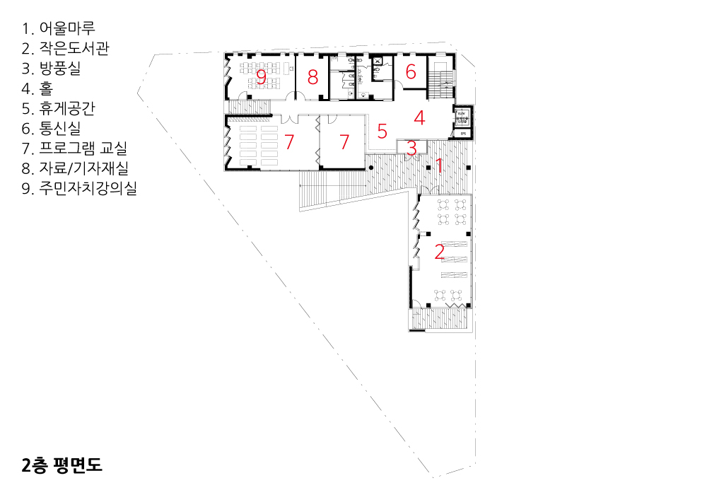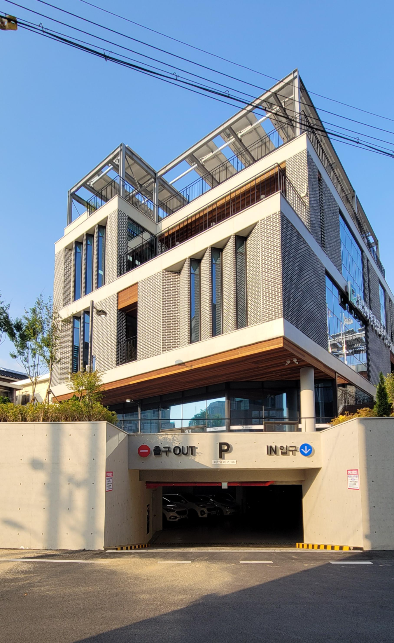The site is a small triangular plot of land located in an old residential area. Setting aside many humanistic stories of the old town located in the city, the client's request for program that creates a small underground parking lot on this small triangular site, and the three roads with a height difference of up to 2m, going up and down without direction have led to an architectural approach of functions. The length of the ramp was minimized by installing the parking lot entrance at the lowest level of the road, and various access routes were formed to keep the flow and memory of existing walking that runs through the site on each road. The first floor was designed to be void to play the role of a yard for a variety of activities, and to maximize the residentriendly nature of an administrative welfare center. The layout of the building was planned in an ‘ㄱ’ shape starting from the most perpendicular part of the triangular site, by taking into account the south-facing environmental characteristics and constructability depending on the form.