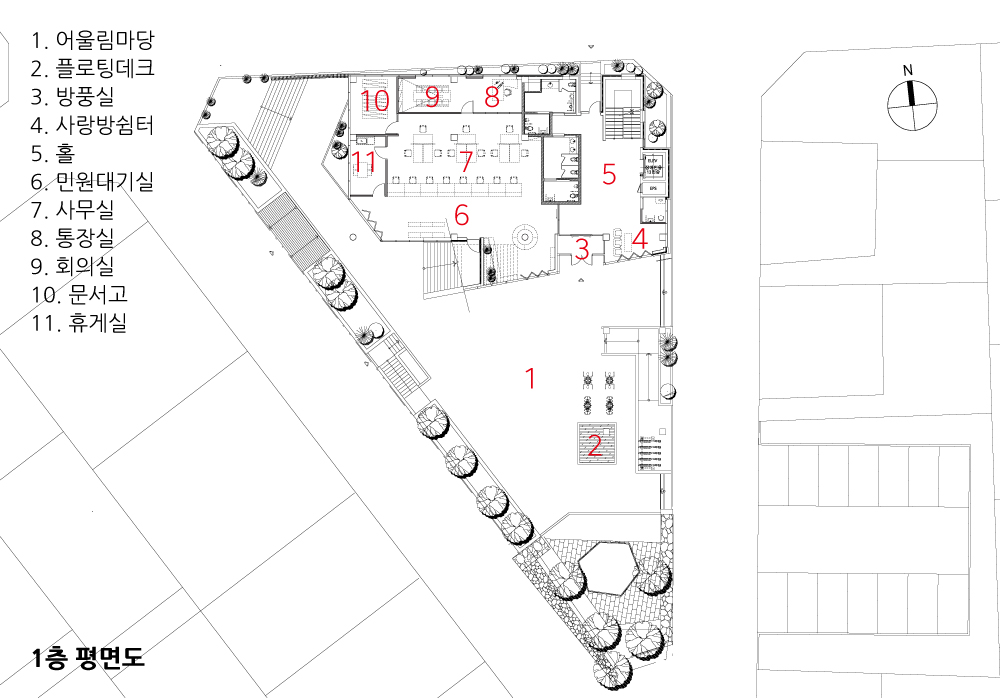 대지는 오래된 주택가에 위치한 삼각형 모양의 작은 땅이다. 도시에 자리한 오래된 마을이 가진 여러 인문학적 이야기를 뒤로한 채, 작은 삼각형 땅 지하를 주차장으로 조성해야 하는 발주처의 프로그램 요구와 방향성 없이 오르내리며 최고 2미터의 높이 차이를 가진 세 도로는 건축에 대한 접근 방식을 다분히 기능의 해결로 귀결되게 만들었다. 도로 레벨이 가장 낮은 부분에 주차장 출입구를 설치해 램프의 길이를 최소화했고, 각 도로에서 대지를 관통하는 기존 보행의 흐름과 기억들을 유지시킨 다양한 접근 동선을 구성하고 1층 부분을 비워내 다양한 행위를 담을 수 있는 마당의 역할을 하게 하였으며, 행정복지센터의 주민친화적 성격이 최대한 발현될 수 있도록 계획했다. 건축물의 배치는 남향에 따른 환경성과 형태에 따른 시공성 등을 고려하여 삼각형 대지의 가장 직각에 가까운 부분을 기점으로 ‘ㄱ’자 형태로 계획했다.