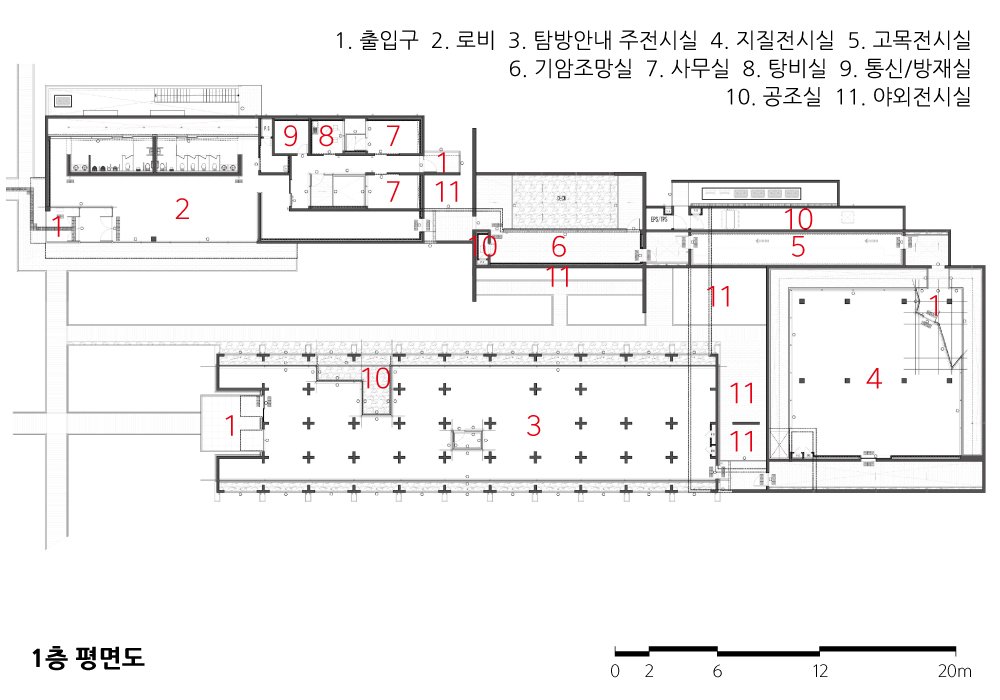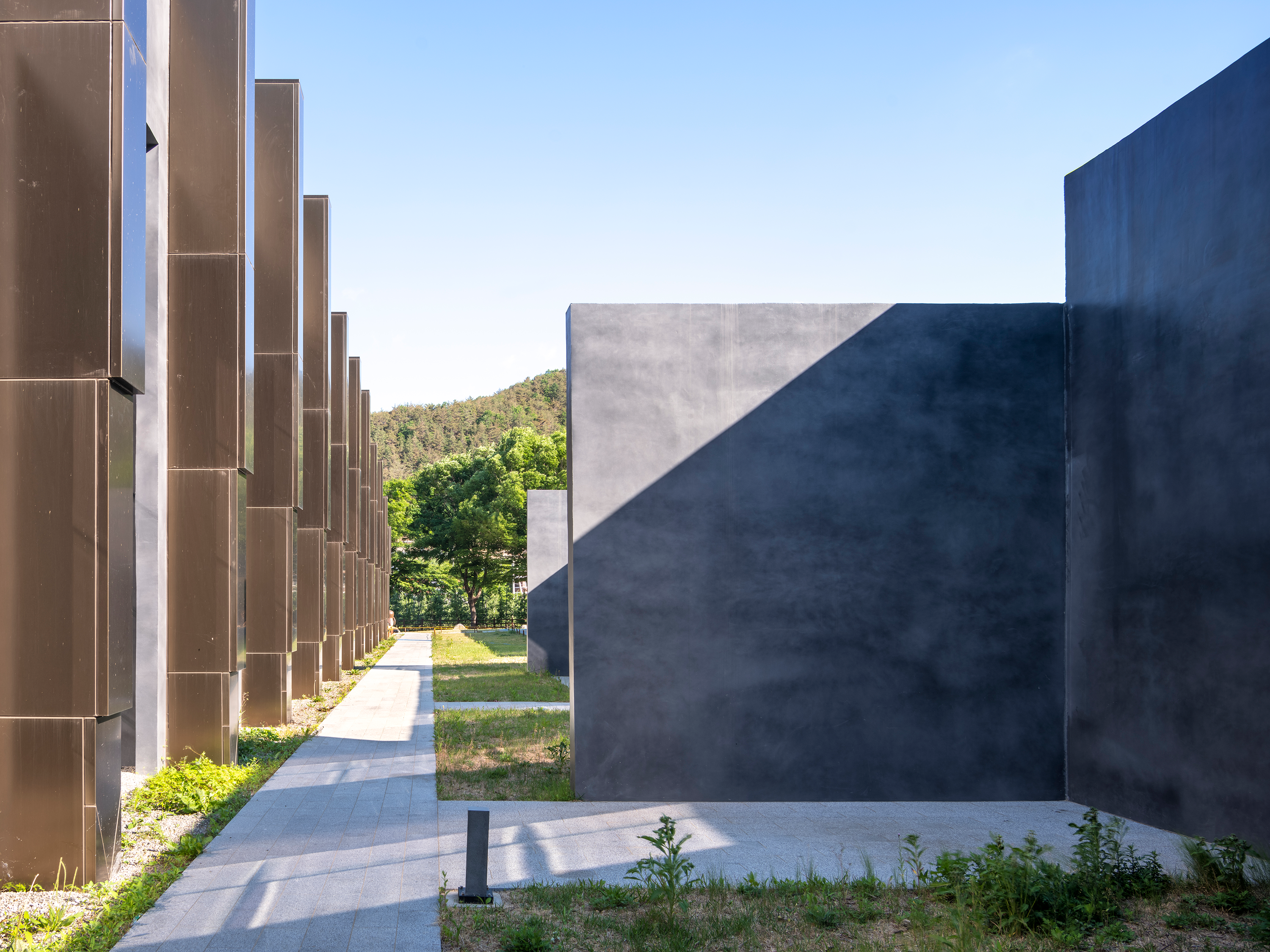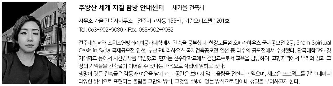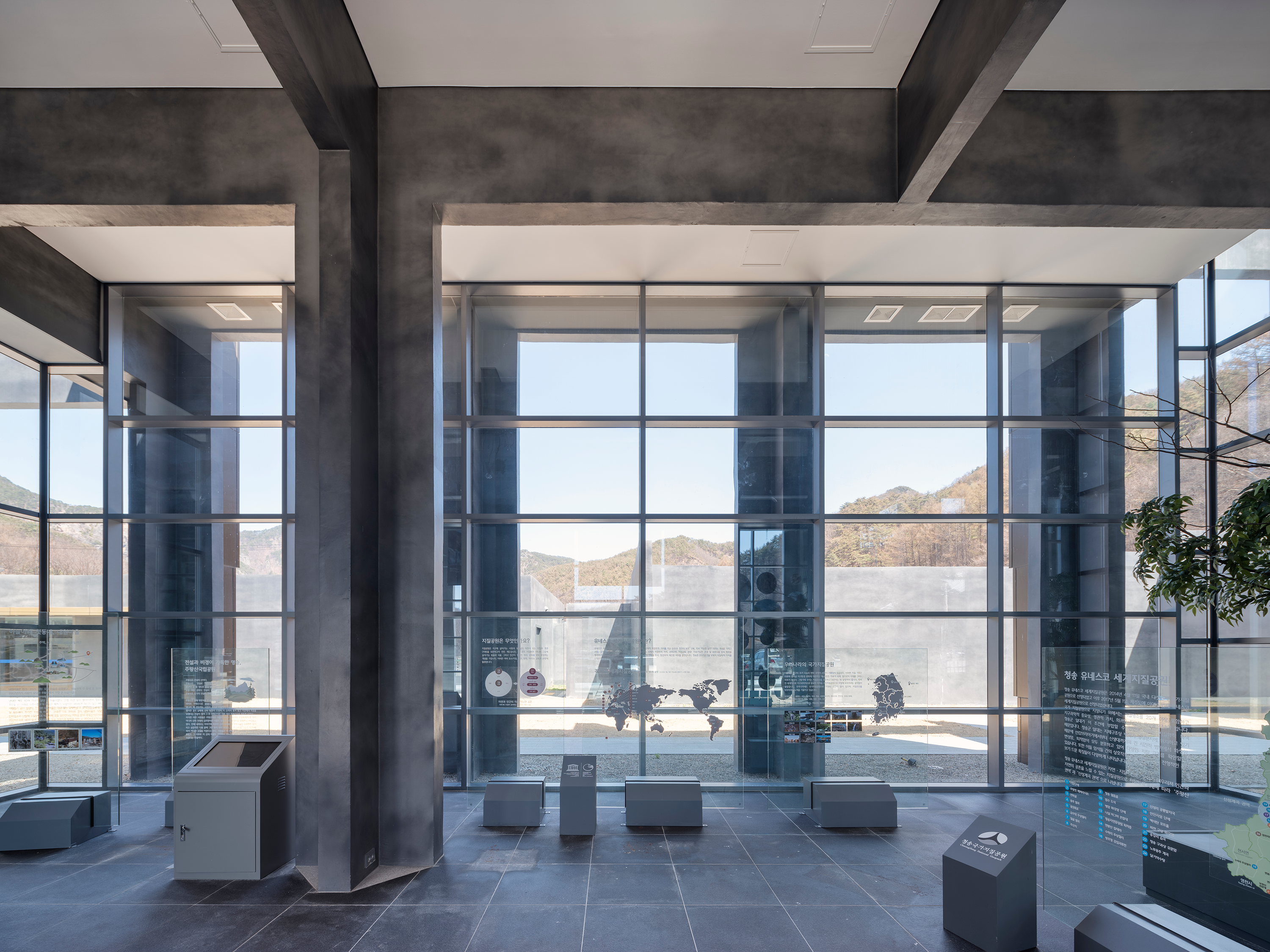 Juwangsan World Geological Exploration Information Center Architect | Chae, Kaeul _ KAEUL architects Seo, Junho _ Madang architects Client | Ministry of Environment(Korea National Park Service Juwangsan National Park Office) Construction | Heunghwa Project team | Yoon, Yuri / Hwang, Hyontae Location | 146, Gongwon-gil, JuWangSan-myeon, Cheongsong-gun, Gyeongsangbuk-do, Korea Program | Culture and assembly facilities Site area | 7,428.00㎡ Building area | 1,111.19㎡ Gross floor area | 1,307.85㎡ Building to land ratio | 14.96% Floor area ratio | 17.61% Building scope | B1F - 1F Structure | RC Exterior finishing | Exposed Concrete, Anodized aluminum Panel, AL curtain wall Interior finishing | Exposed Concrete, granite stone Design period | Apr. 2019 - Mar. 2020 Construction period | Mar. 2020 - Dec. 2021 Photograph | Namgung, Sun Structural engineer | Dowon E&C Mechanical engineer | ENS Inc. Electrical engineer | Won ENC Inc. Landscaping engineer | Openness studio |