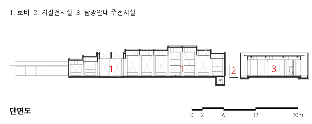 | 주왕산 세계 지질 탐방 안내센터 설계자 | 채가을 _ 가을 건축사사무소 서준호 _ 건축사사무소 마당 건축주 | 환경부(국립공원공단 주왕산국립공원사무소) 시공사 | (주)흥화건설 설계팀 | 윤유리, 황현태 대지위치 | 경상북도 청송군 주왕산면 공원길 146 주요용도 | 문화 및 집회시설 대지면적 | 7,428.00㎡ 건축면적 | 1,111.19㎡ 연면적 | 1,307.85㎡ 건폐율 | 14.96% 용적률 | 17.61% 규모 | B1F - 1F 구조 | 철근콘크리트구조 외부마감재 | 노출콘크리트, 아노다이징 알루미늄판넬, AL커튼월 내부마감재 | 노출콘크리트, 마천석, 석고보드 설계기간 | 2019. 04 - 2020. 03 공사기간 | 2020. 03 - 2021. 12 사진 | 남궁선 구조 | 박성무 _ 도원E&C 기계설비 | 김재철 _ 주식회사 이앤에스 전기 | 임형관 _ (주)원이엔씨 조경 | 최재혁 _ 오픈니스 |