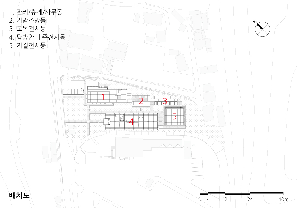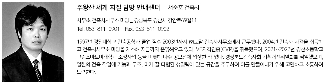 Juwangsan World Geological Exploration Information Center Architect | Chae, Kaeul _ KAEUL architects Seo, Junho _ Madang architects Client | Ministry of Environment(Korea National Park Service Juwangsan National Park Office) Construction | Heunghwa Project team | Yoon, Yuri / Hwang, Hyontae Location | 146, Gongwon-gil, JuWangSan-myeon, Cheongsong-gun, Gyeongsangbuk-do, Korea Program | Culture and assembly facilities Site area | 7,428.00㎡ Building area | 1,111.19㎡ Gross floor area | 1,307.85㎡ Building to land ratio | 14.96% Floor area ratio | 17.61% Building scope | B1F - 1F Structure | RC Exterior finishing | Exposed Concrete, Anodized aluminum Panel, AL curtain wall Interior finishing | Exposed Concrete, granite stone Design period | Apr. 2019 - Mar. 2020 Construction period | Mar. 2020 - Dec. 2021 Photograph | Namgung, Sun Structural engineer | Dowon E&C Mechanical engineer | ENS Inc. Electrical engineer | Won ENC Inc. Landscaping engineer | Openness studio |