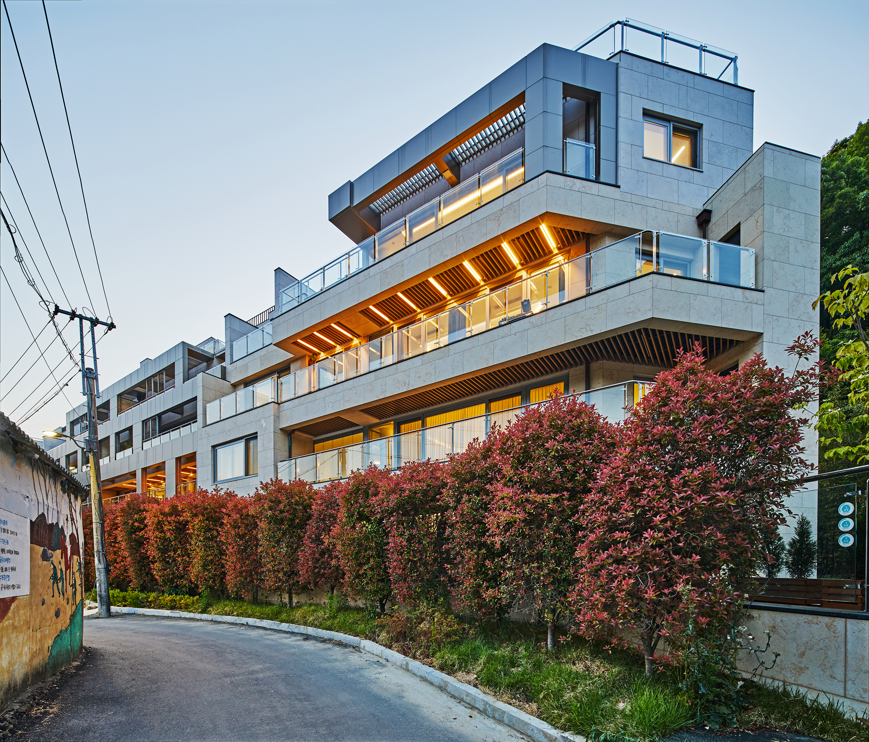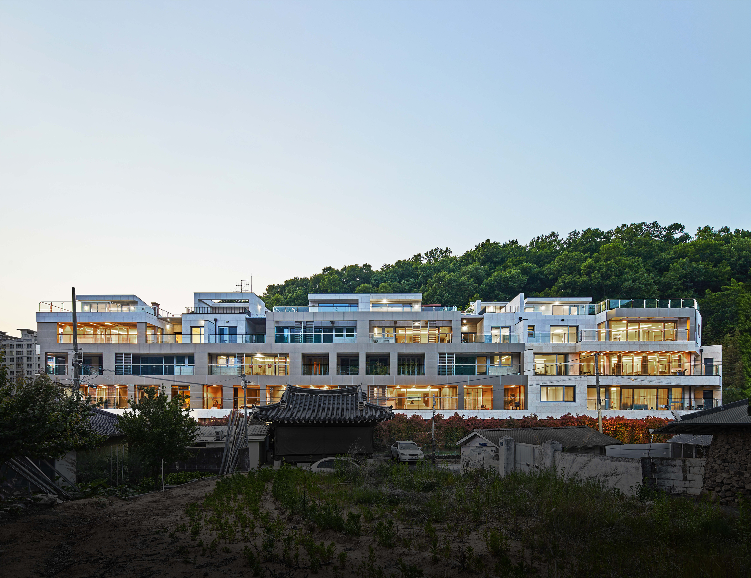 주로 신경 쓴 점은 단독주택이 주를 이루는 마을에 어떻게 해야 공동주택의 볼륨이 이질적이지 않게 보일 것인가에 대한 것이다. 대지는 동네 어귀, 분적산 자락을 배경으로 위치해있다. 산비탈이라는 지형적 연속성을 확보하기 위해 층층이 뒤로 밀려나는 테라스하우스를 건축함으로써 유사한 위요감을 제공하고, 마을의 경관에서 배경이 되는 건축이 되도록 했다.