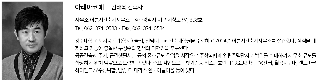 | 아레아코메 설계자 | 김태욱 _ 아름지건축사사무소 이봉주 _ (주)건축사사무소 위가 건축주 | (유)모람 감리자 | 박민주 _ 건축사사무소 덕인 시공사 | (주)우성종합건설 설계팀 | 아름지 _ 홍정화 / 위가 _ 김대욱, 손인국, 조권영, 김건 대지위치 | 광주광역시 남구 노대마을1길 23 주요용도 | 공동주택 대지면적 | 2,113.00㎡ 건축면적 | 1,128.72㎡ 연면적 | 4,487.88㎡ 건폐율 | 53.42% 용적률 | 139.67% 규모 | B1F - 4F 구조 | 철근콘크리트구조 외부마감재 | 라임스톤 설계기간 | 2018. 04 - 2019. 04 공사기간 | 2019. 07 - 2020. 09 사진 | 김현수 구조 | NS ENG 기계설비 | 삼원 ENG 전기 | 한길 ENG 소방분야 | 한길 ENG |