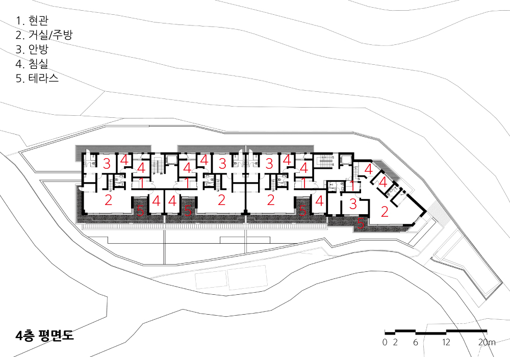 Project main focus was on how to make the volume of multi-nit dwellings look consistent in a village consisting largely of detached houses. The site is located at the entrance of the village, at the foot of Mt. Bunjeok as a background. In order to secure the topographic continuity of the hillside, it was designed to be a terraced house in a form of back-to-backs to provide a kind of enclosure and to serve as a background in the village’s landscape.