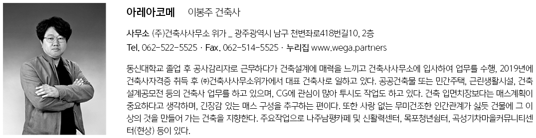 árĕacōmē Architect | Kim, Taewook _ Arumji Architectural office Lee, Bongju _ Wega Architects Co. Ltd. Client | Moram Supervisor | Park,Minju _ Deokin Architects Construction | Woosung Construction Project team | Arumji _ Hong, Junghwa / Wega _ Kim, Daewook / Son, Inkuk / Jo, Gwonyoung / Kim, Geon Location | 23, Nodaemaeul 1-gil, Nam-gu, Gwangju, Korea Program | Apartment house Site area | 2,113.00㎡ Building area | 1,128.72㎡ Gross floor area | 4,487.88㎡ Building to land ratio | 53.42% Floor area ratio | 139.67% Building scope | B1F - 4F Structure | RC Exterior finishing | Lime stone Design period | 2018. 04 - 2019. 04 Construction period | 2019. 07 - 2020. 09 Photograph | Kim, Hyunsu Structural engineer | NS ENG Mechanical engineer | Samwon ENG Electrical engineer | Hangil ENG Fire engineer | Hangil ENG |