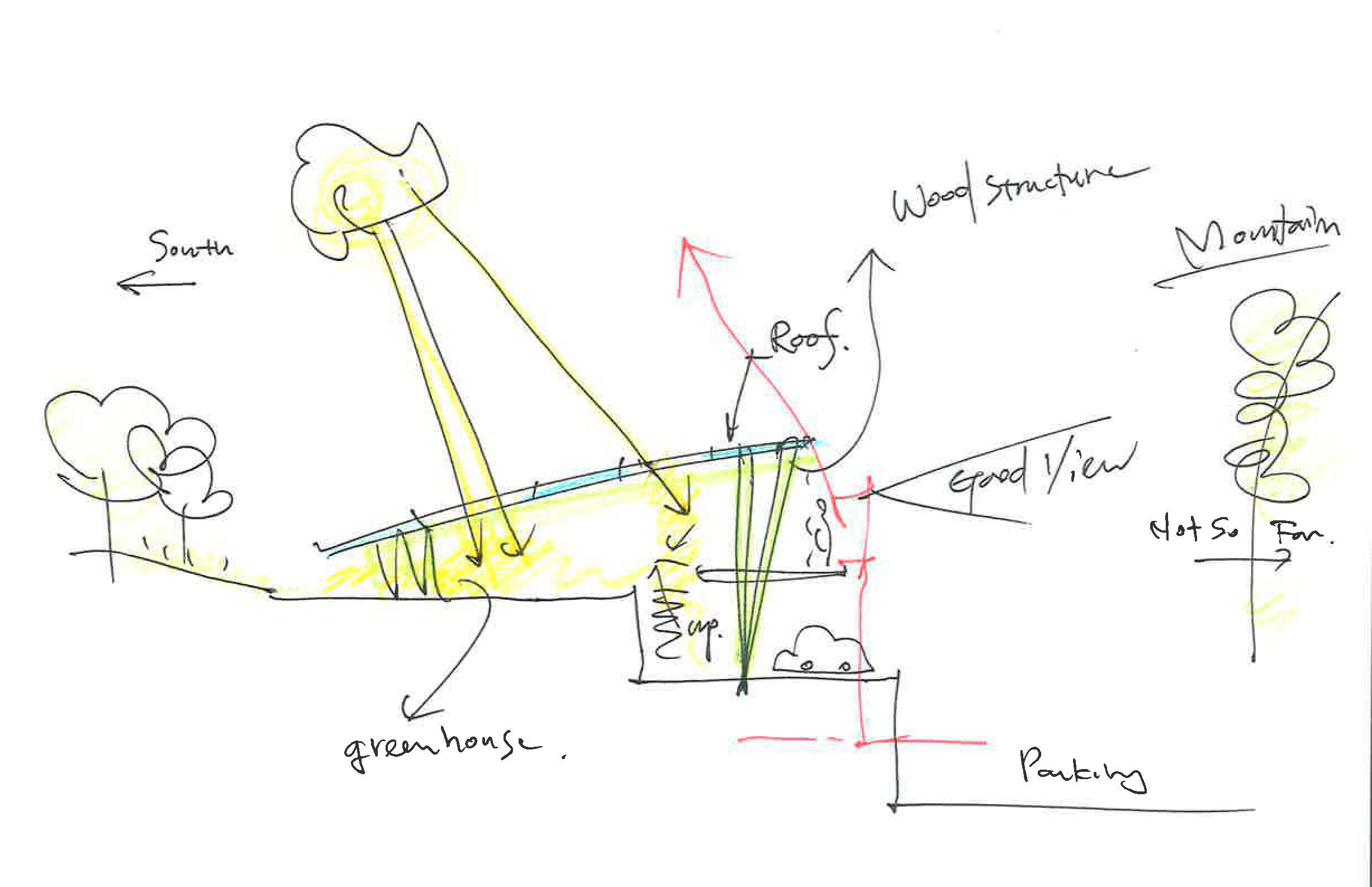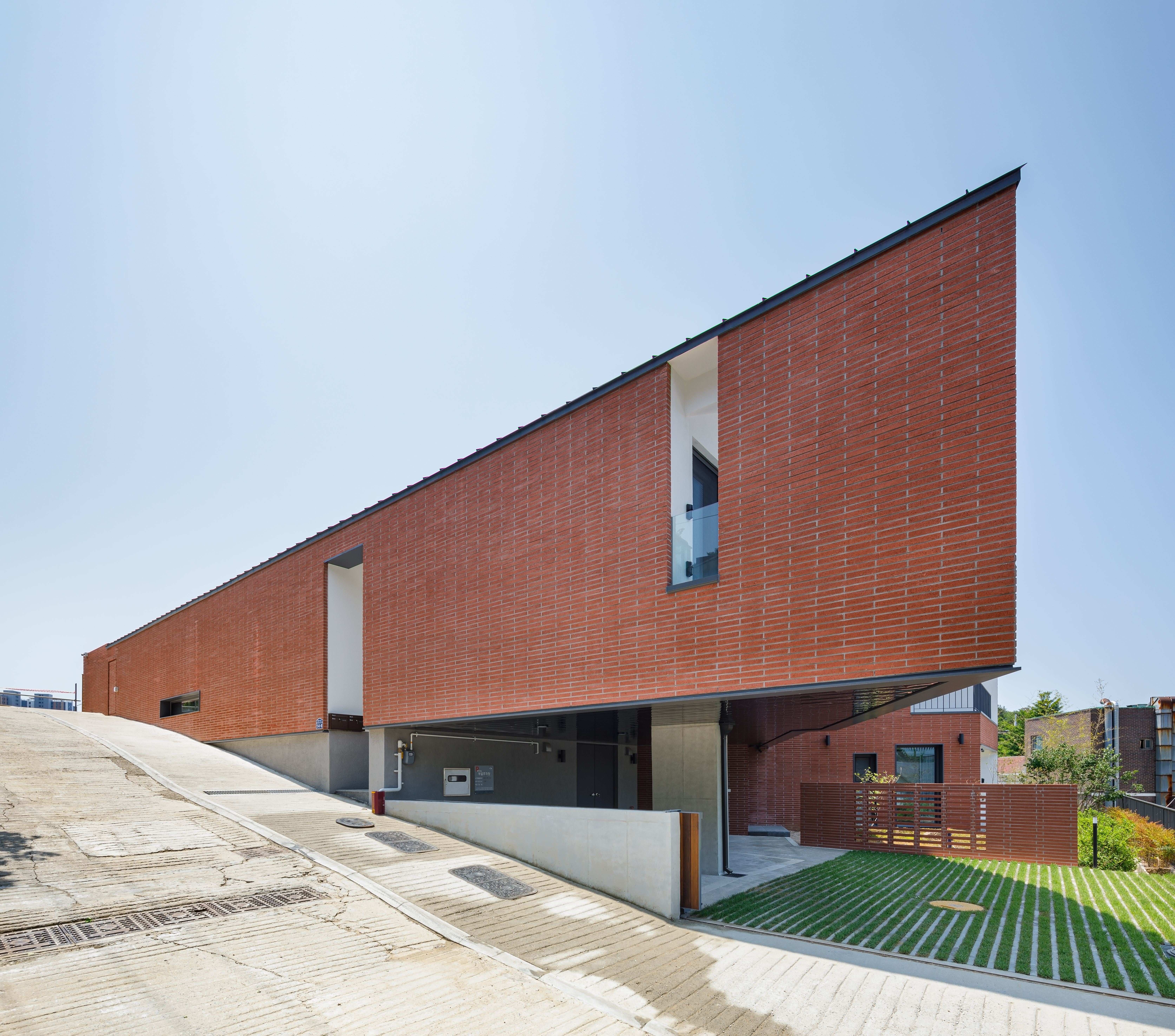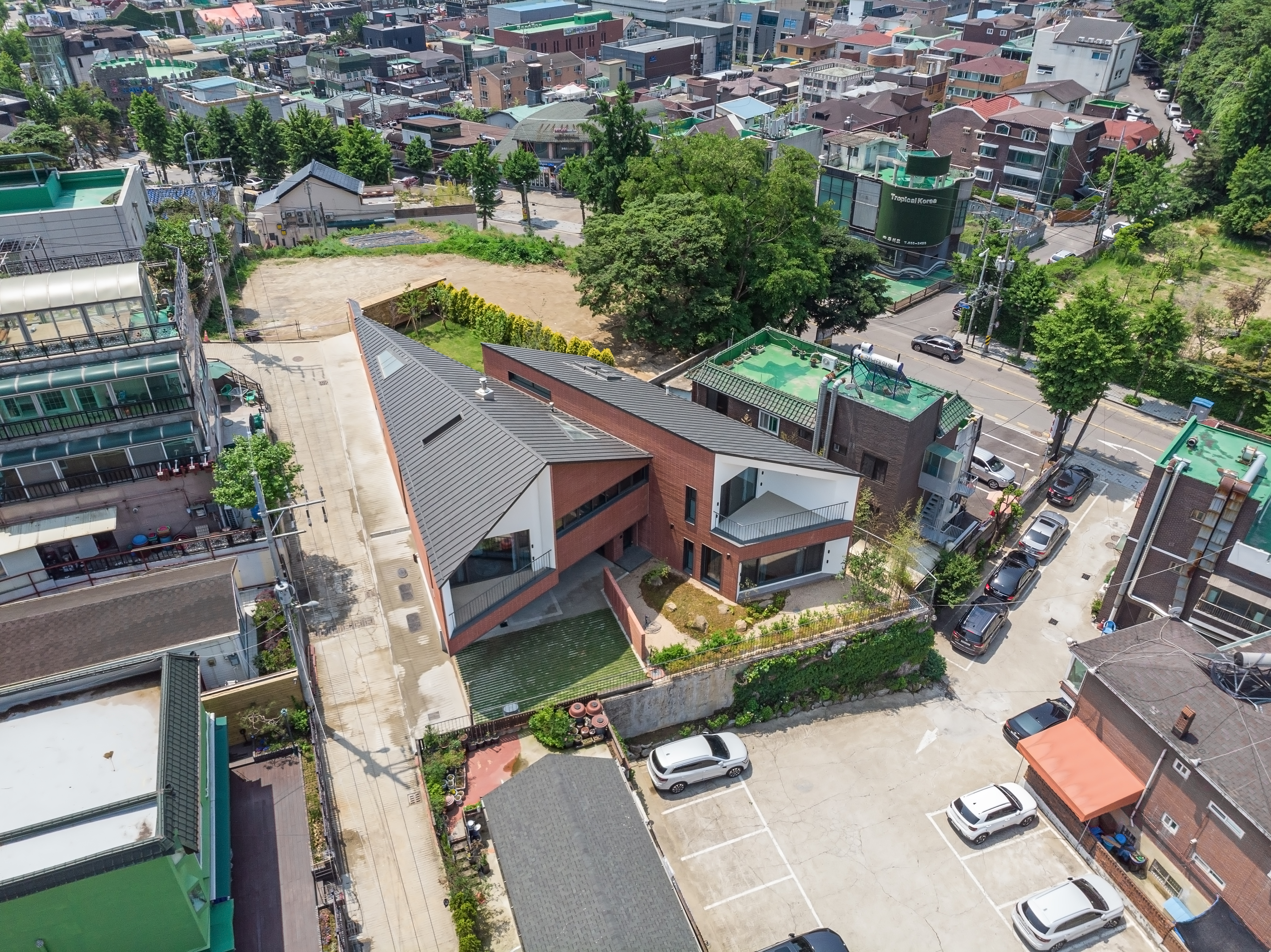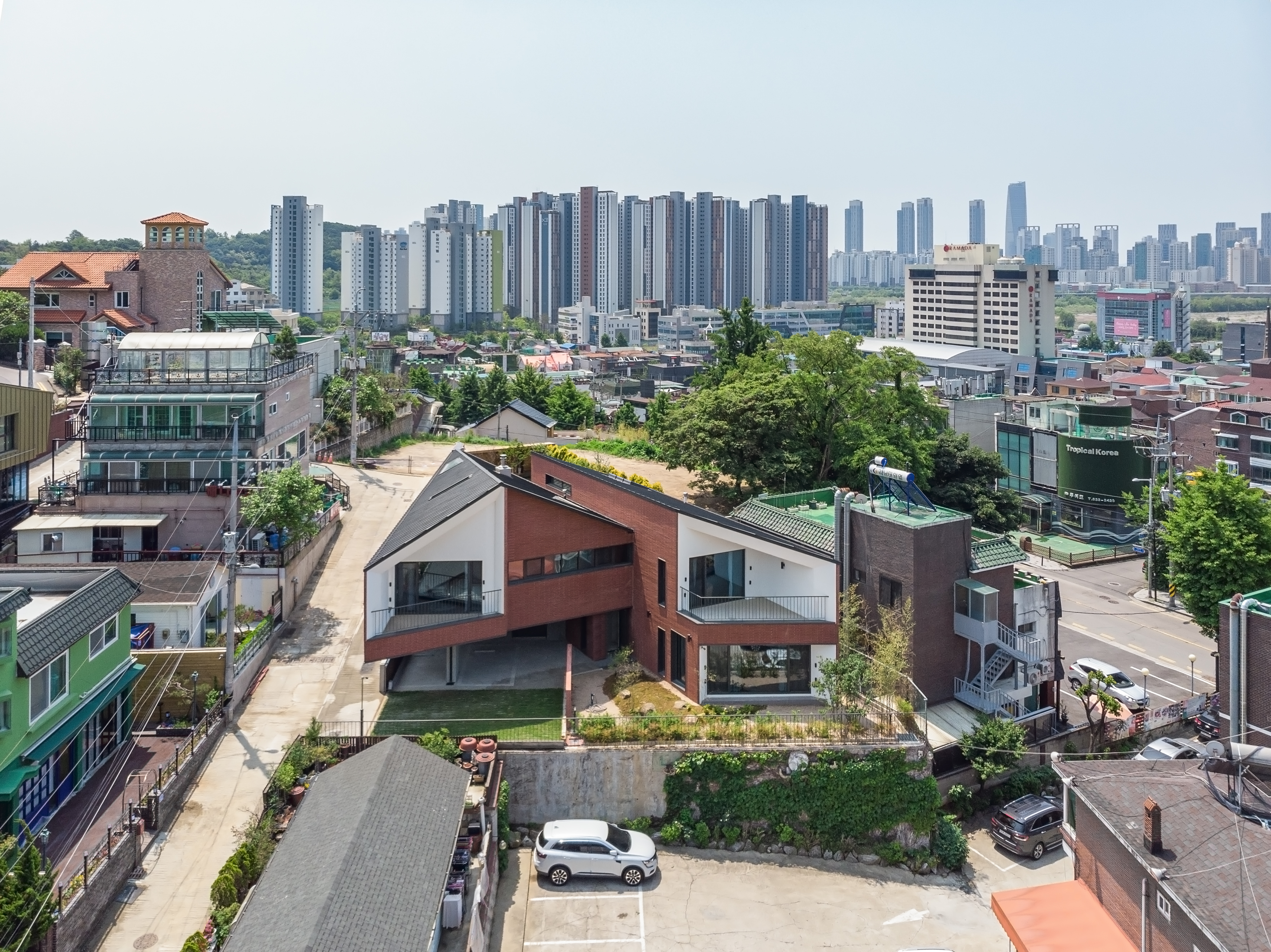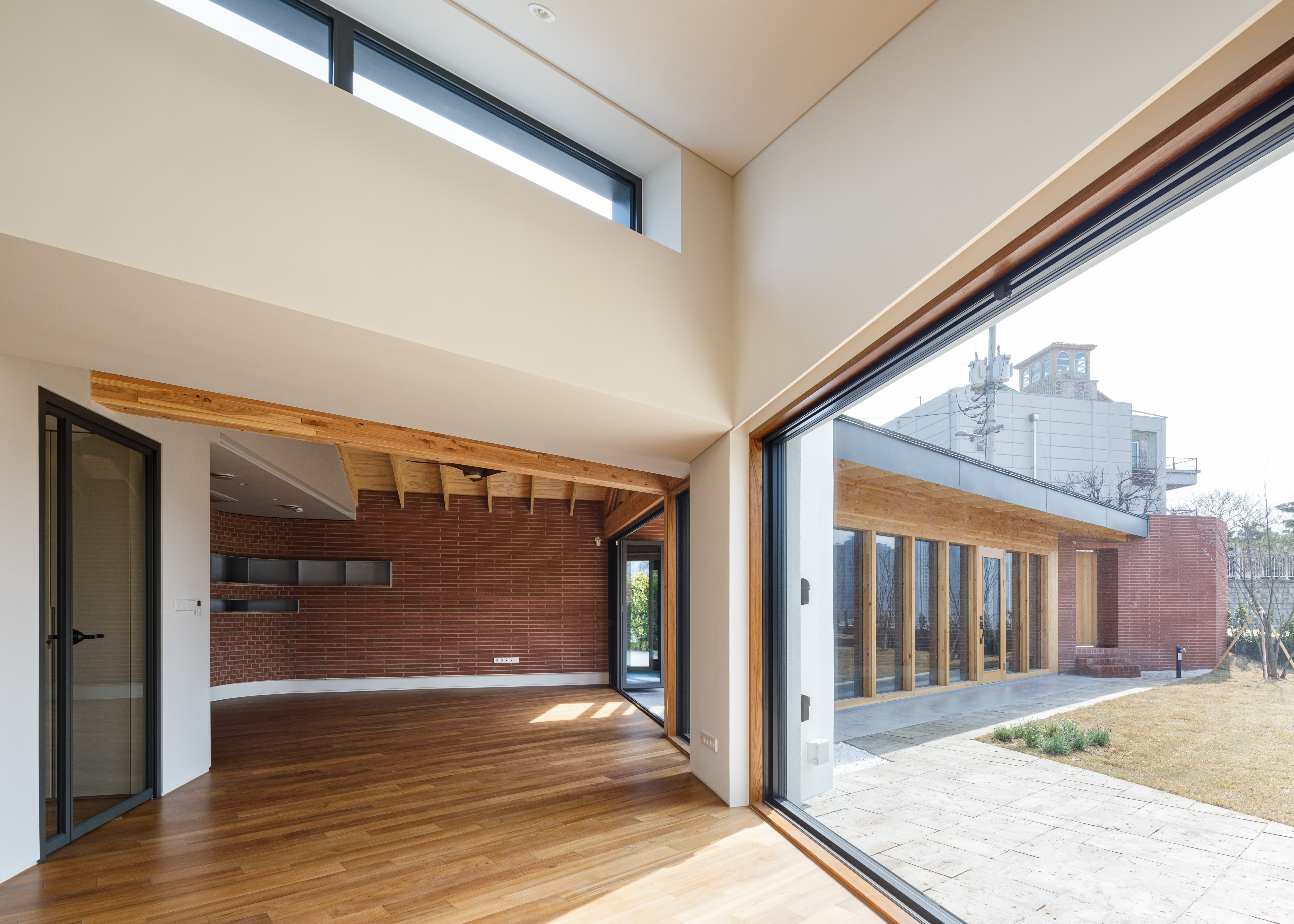 A yard was placed on the high side (south) of the site, having a greenhouse, a living room, a kitchen, and a dining room connected to the yard. There are two rooms on the second floor and a multipurpose room on the first floor to the north with a view of Cheongnyangsan Mountain, and a small yard and parking lot are placed in front of the multipurpose room on the first floor. The main entrance is on the second floor. In addition to the concrete structure, heavy timber construction was applied for the roof of the greenhouse and the living room on the second floor to expose the timber, and various insulation materials were used.