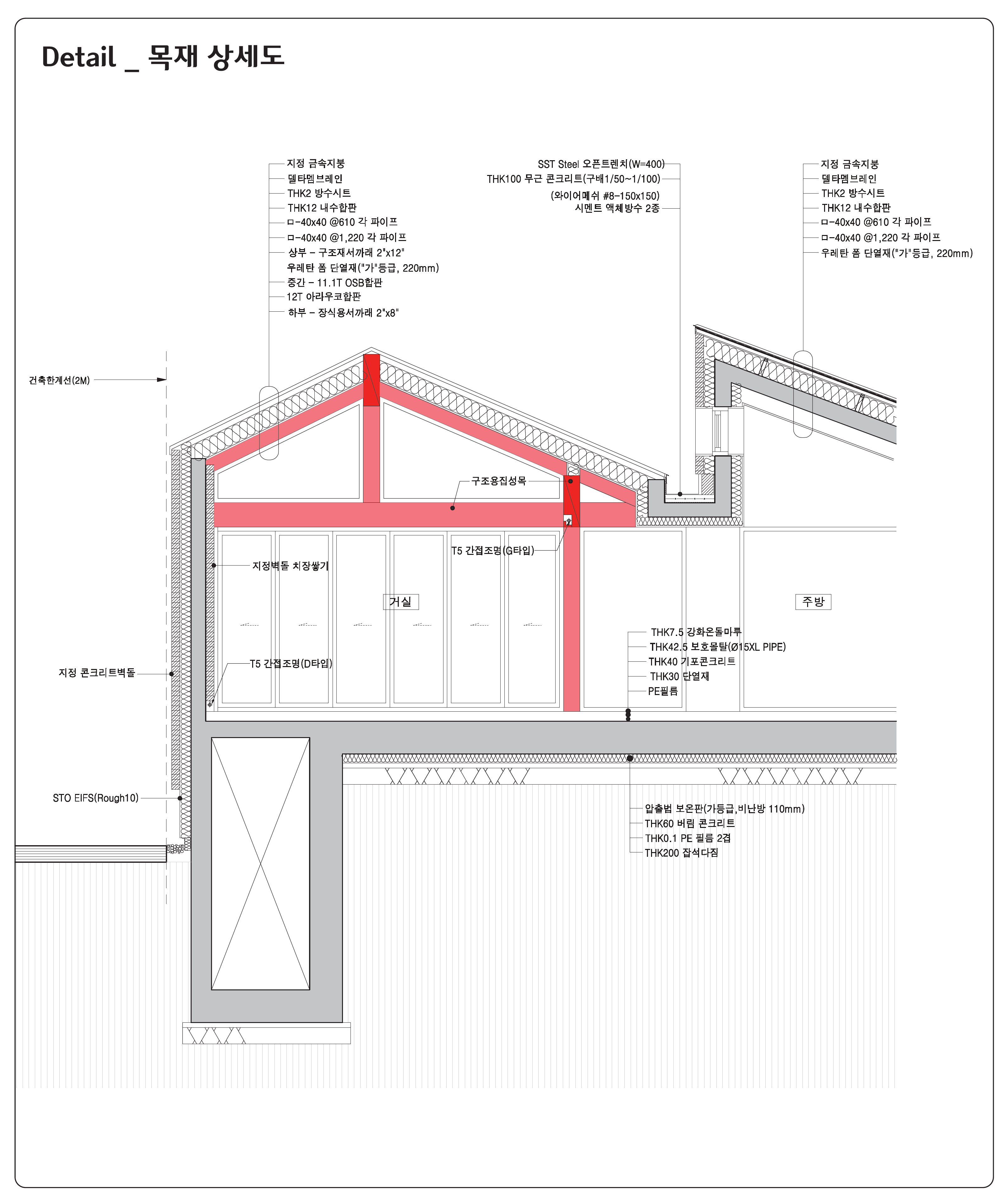 | 동춘온실(東春溫室) 설계자 | 이재혁 _ (주)에이디모베 건축사사무소 건축주 | 박경숙 감리자 | 이재혁 (주)에이디모베 건축사사무소 시공사 | 하광수 _ (주)우리마을A&C / (주)수피아건축(목구조) 설계팀 | 이주화, 임동연 대지위치 | 인천광역시 연수구 동춘동 주요용도 | 단독주택 대지면적 | 617.80㎡ 건축면적 | 233.78㎡ 연면적 | 294.47㎡ 건폐율 | 37.84% 용적률 | 47.66% 규모 | 2F 구조 | 철근콘트리트구조, 중목구조 외부마감재 | 벽+천 _수성페인트(벤자민무어), 콘크리트 면보수, DURASTACK 탱고레드 / 지붕 _ THK5.0 JAL ZINK / 창호 _이건 알미늄창호 + thk43 로이삼중유리, VELUX GPL + thk24 복층유리 내부마감재 | 바닥 _ thk8 이건마루 / 벽+천장 _ 수성페인트(벤자민무어), 콘크리트 면보수 / 계단재 _ thk30 오크 집성목+투명 스테인 / 타일 _ 윤현상재 설계기간 | 2019. 11 - 2020. 07 공사기간 | 2020. 08 - 2021. 04 사진 | 김창묵 구조 | 김형만 _ (주)허브구조 / 금나구조(목구조) 기계설비 | 김성률 _ 유영설비기술연구소 전기 | 김기표 _ 거산ENG 조경 | 이대영 _ 조경상회 |