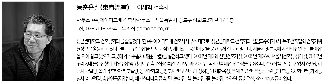 대지는 662제곱미터(200평)가 조금 안 되는 땅으로, 3.5미터 높이의 두 개의 축대로 나누어져 있는, 남쪽이 뾰족한 삼각형 모양이다. 꽃과 나무를 가꾸고 붓글씨를 즐기는 건축주는 “작은 온실을 마당에 두고 싶다”고 했다. 정원을 가꾸며 시간을 보내는 삶을 원하는 건축주를 위해 이 온실을 거실 모서리에 연결시켜 온실과 거실이 연결된 ‘동춘온실(東春溫室)'을 완성했다. 동춘온실(東春溫室)은 집안 어느 곳에서나 정원과 산을 바라볼 수 있는 ‘순환하는 동선'을 뜻한다.