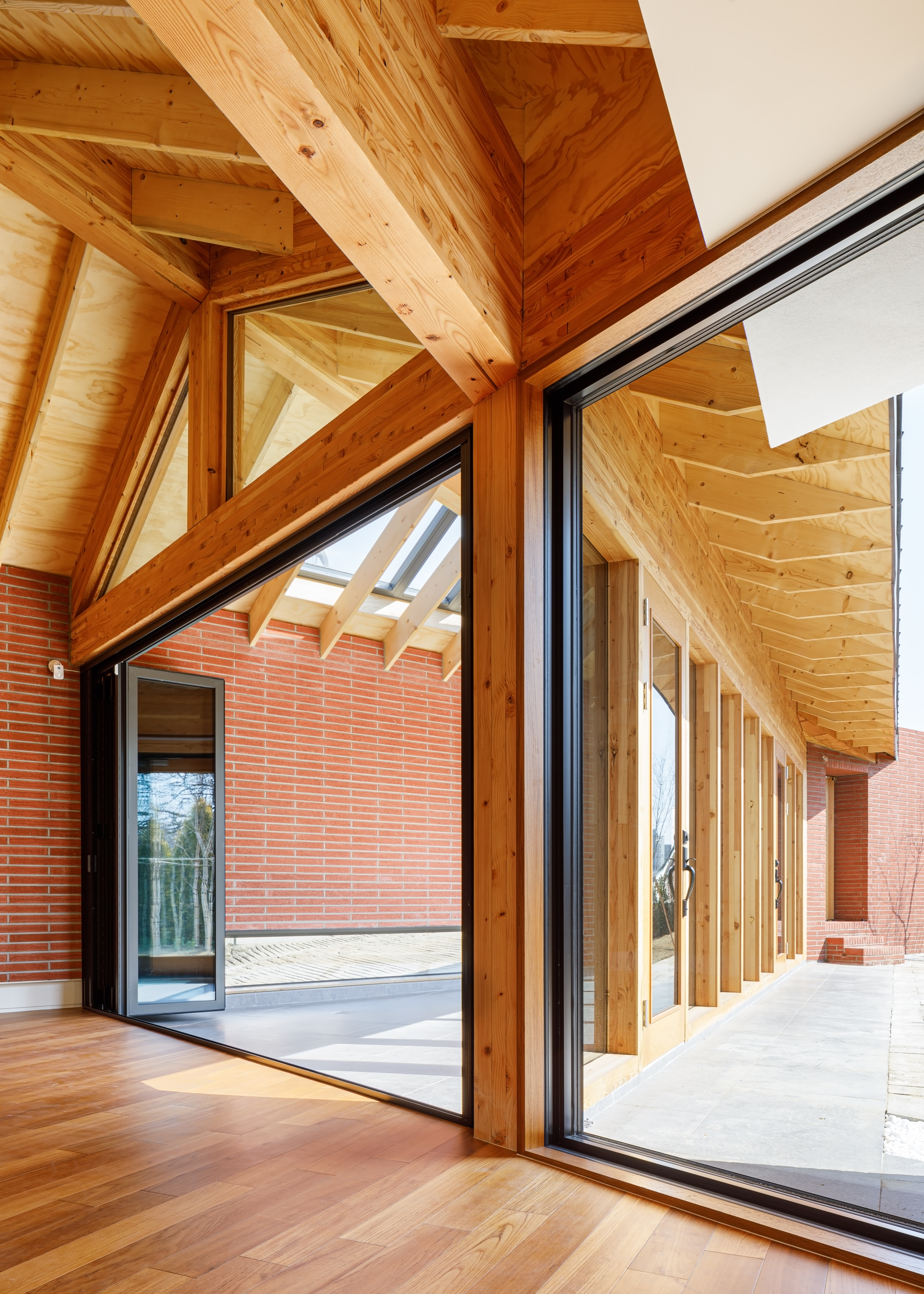 The exterior was designed to give the impression that long brick walls are like floating along the long road. On the north side, it was designed as if there were two roofs, and on the south side, large open windows and finely divided wooden windows in the greenhouse create a sense of rhythm.