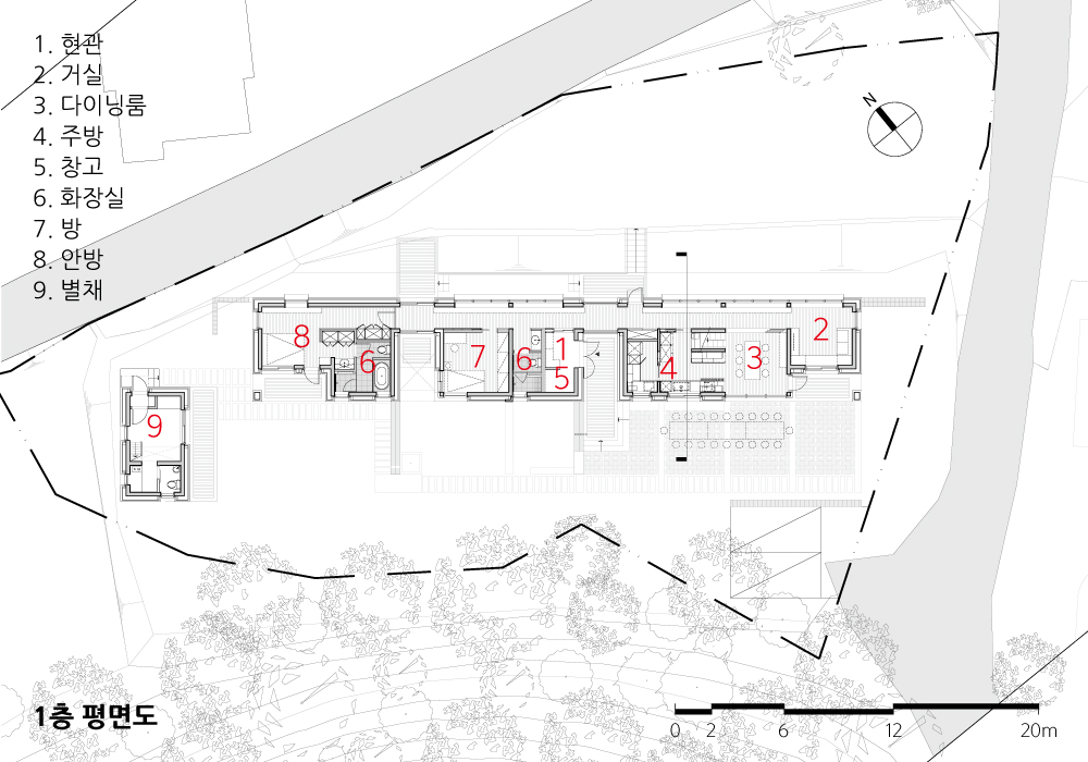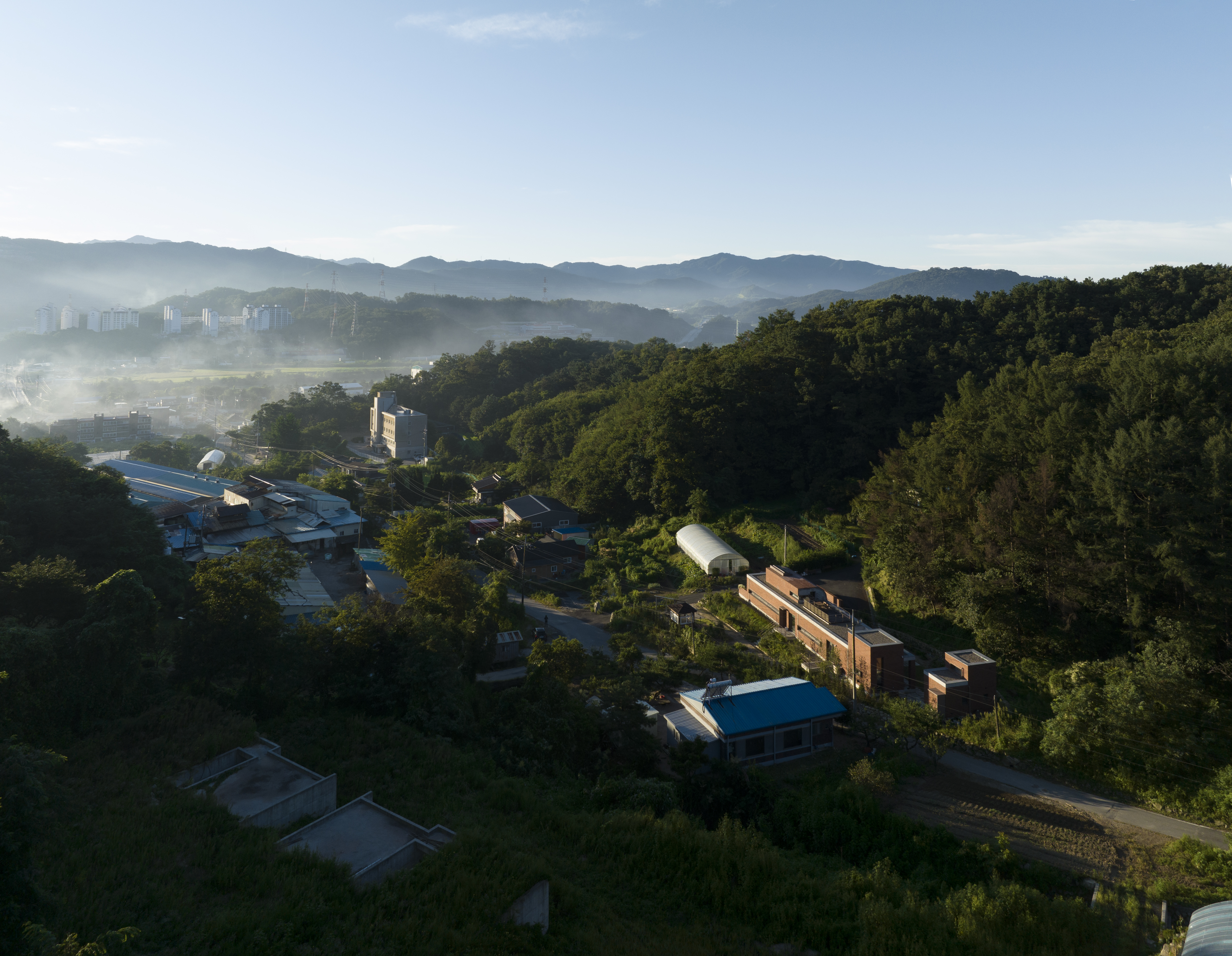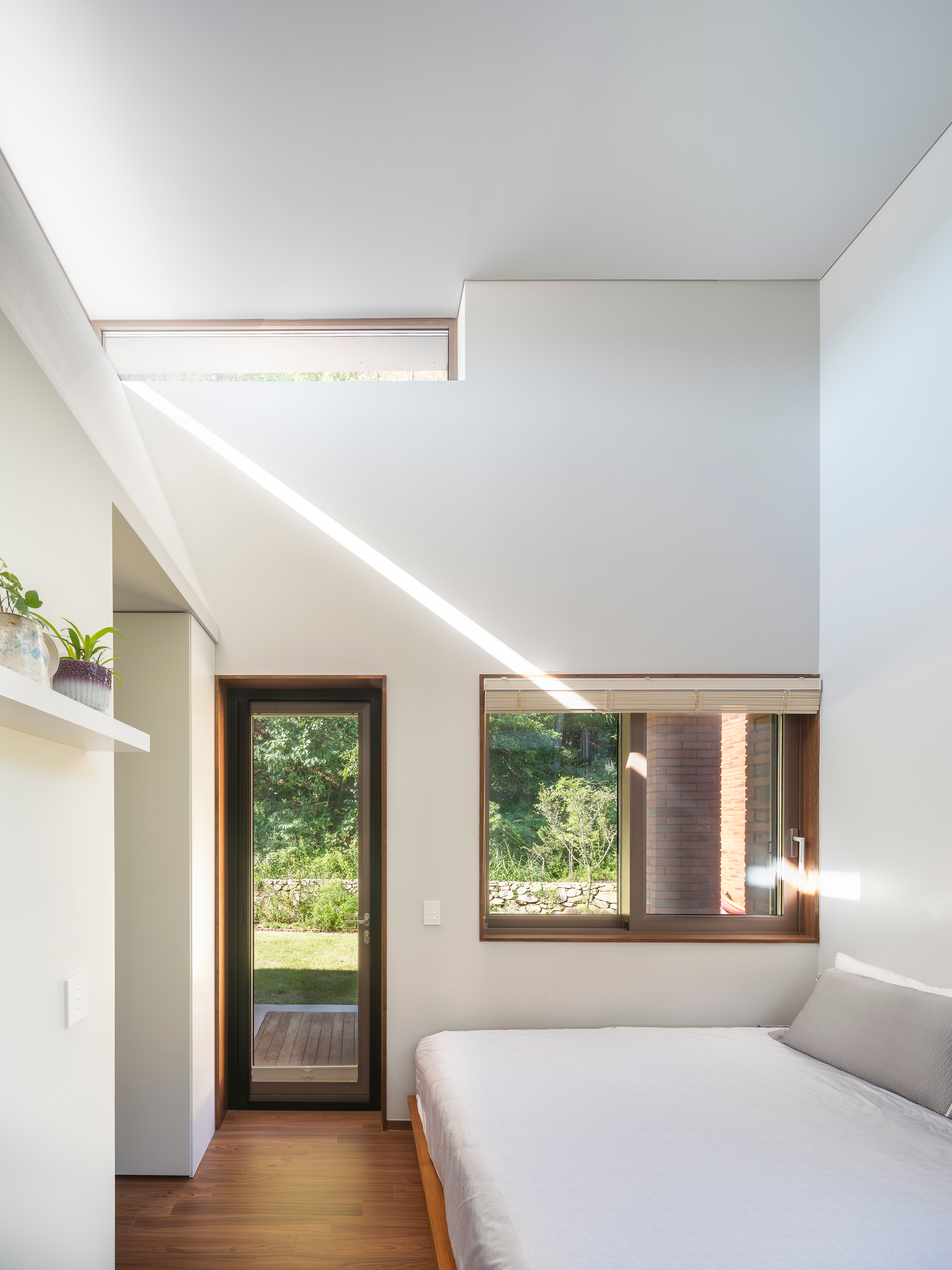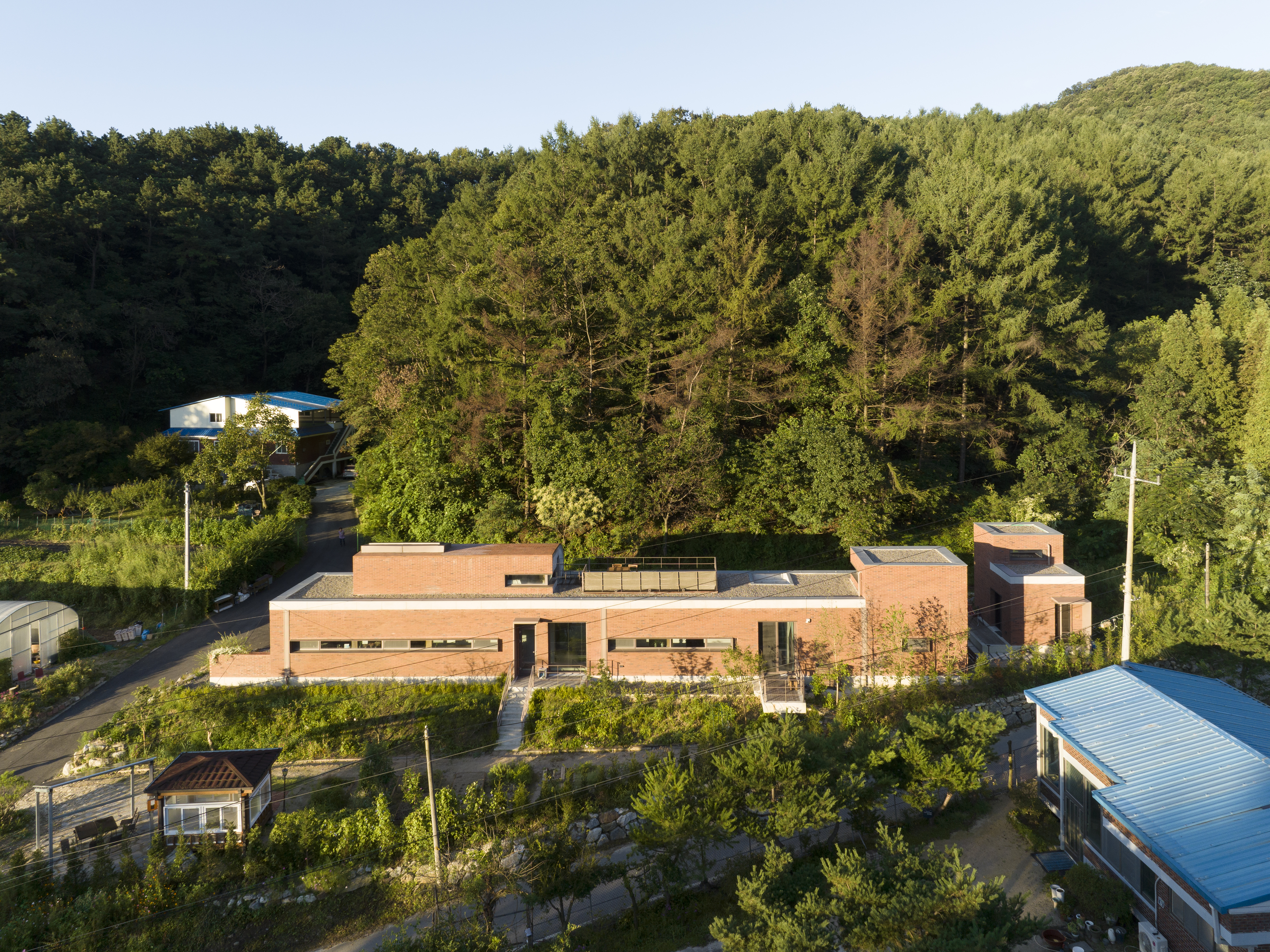 따로 담장을 세우지 않고 긴 매스의 마을 길에 면한 쪽은 창을 낮고 길게 두었다. 마을 길에서 바라볼 때 폐쇄적이지 않을 만큼의 개구부를 갖고, 낮은 땅에 조경할 작은 숲과 밭으로 정겨운 풍경을 유지한다. 안 마당은 어머니의 창을 바라고 가까운 산새를 받아들인다. 들고 나는 곡선형 산새로 인해 안 마당은 입구 쪽부터 안방, 깊은 곳의 별채까지 다양한 풍경을 담고 있다. 또 낮은 담을 적당히 두어 구성에 도움을 주었다.