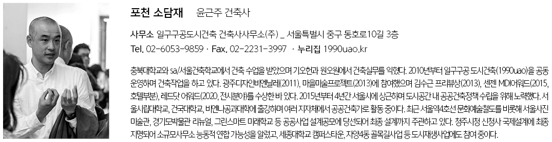 | 포천 소담재 설계자 | 윤근주 _ 일구구공도시건축 건축사사무소(주) 건축주 | 우현주 감리자 | 윤근주 _ 일구구공도시건축 건축사사무소(주) 시공사 | 공디자인 설계팀 | 민경현, 박진영 설계의도 구현 | 일구구공도시건축 건축사사무소(주) 대지위치 | 경기도 포천시 신북면 중앙로405번길 49 주요용도 | 단독주택 대지면적 | 873.00㎡ 건축면적 | 165.13㎡ 연면적 | 150.63㎡ 건폐율 | 14.75% 용적률 | 13.45% 규모 | 1F 구조 | 철근콘크리트구조 외부마감재 | 치장벽돌(우성 로만레드, WS3406) 내부마감재 | 노출콘크리트, 타일, 강마루 설계기간 | 2020. 08 – 2020. 12 공사기간 | 2021. 03 – 2021. 10 사진 | 남궁선 구조 | (주)이든구조컨설턴트 |