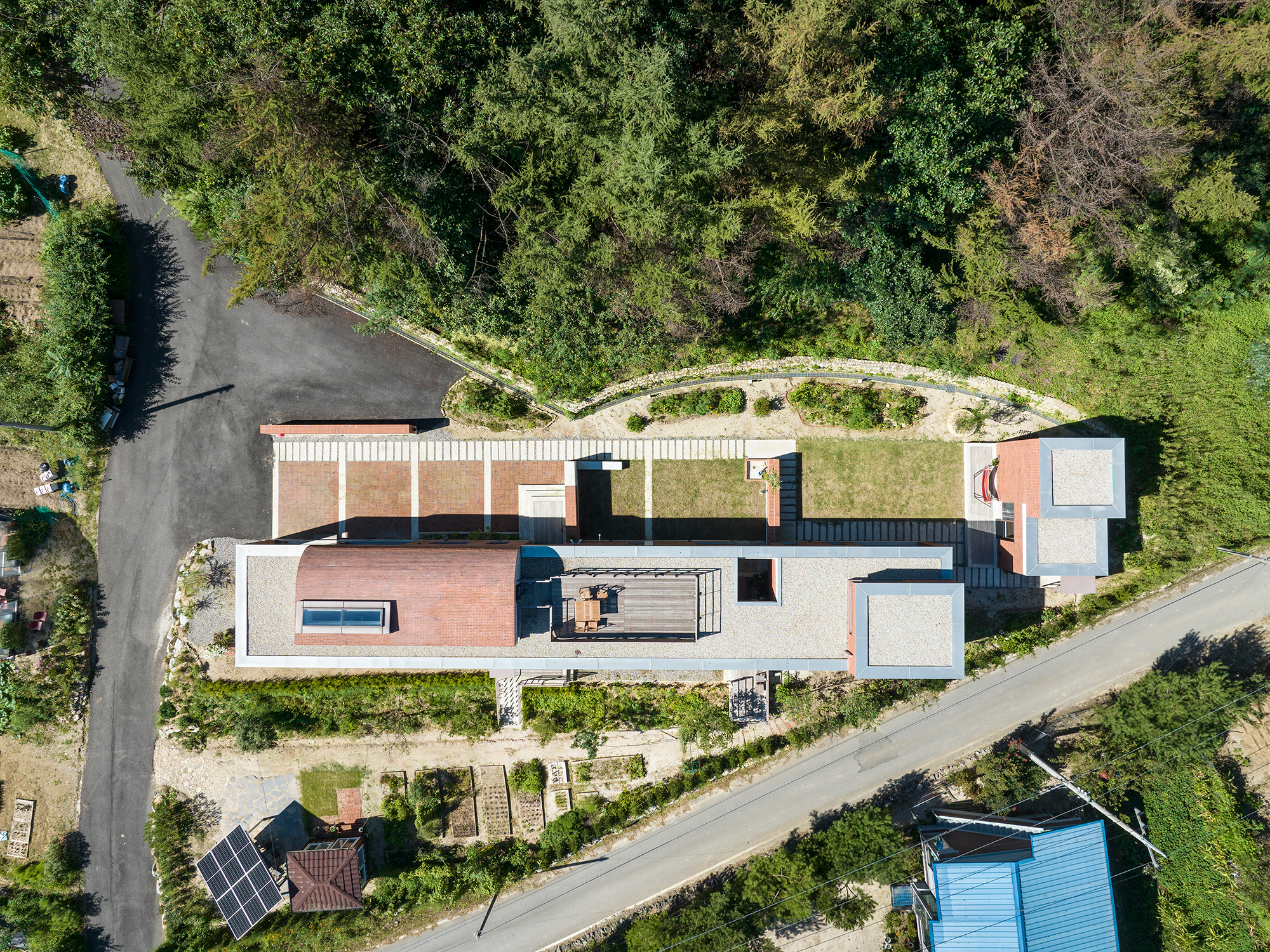 따로 담장을 세우지 않고 긴 매스의 마을 길에 면한 쪽은 창을 낮고 길게 두었다. 마을 길에서 바라볼 때 폐쇄적이지 않을 만큼의 개구부를 갖고, 낮은 땅에 조경할 작은 숲과 밭으로 정겨운 풍경을 유지한다. 안 마당은 어머니의 창을 바라고 가까운 산새를 받아들인다. 들고 나는 곡선형 산새로 인해 안 마당은 입구 쪽부터 안방, 깊은 곳의 별채까지 다양한 풍경을 담고 있다. 또 낮은 담을 적당히 두어 구성에 도움을 주었다.