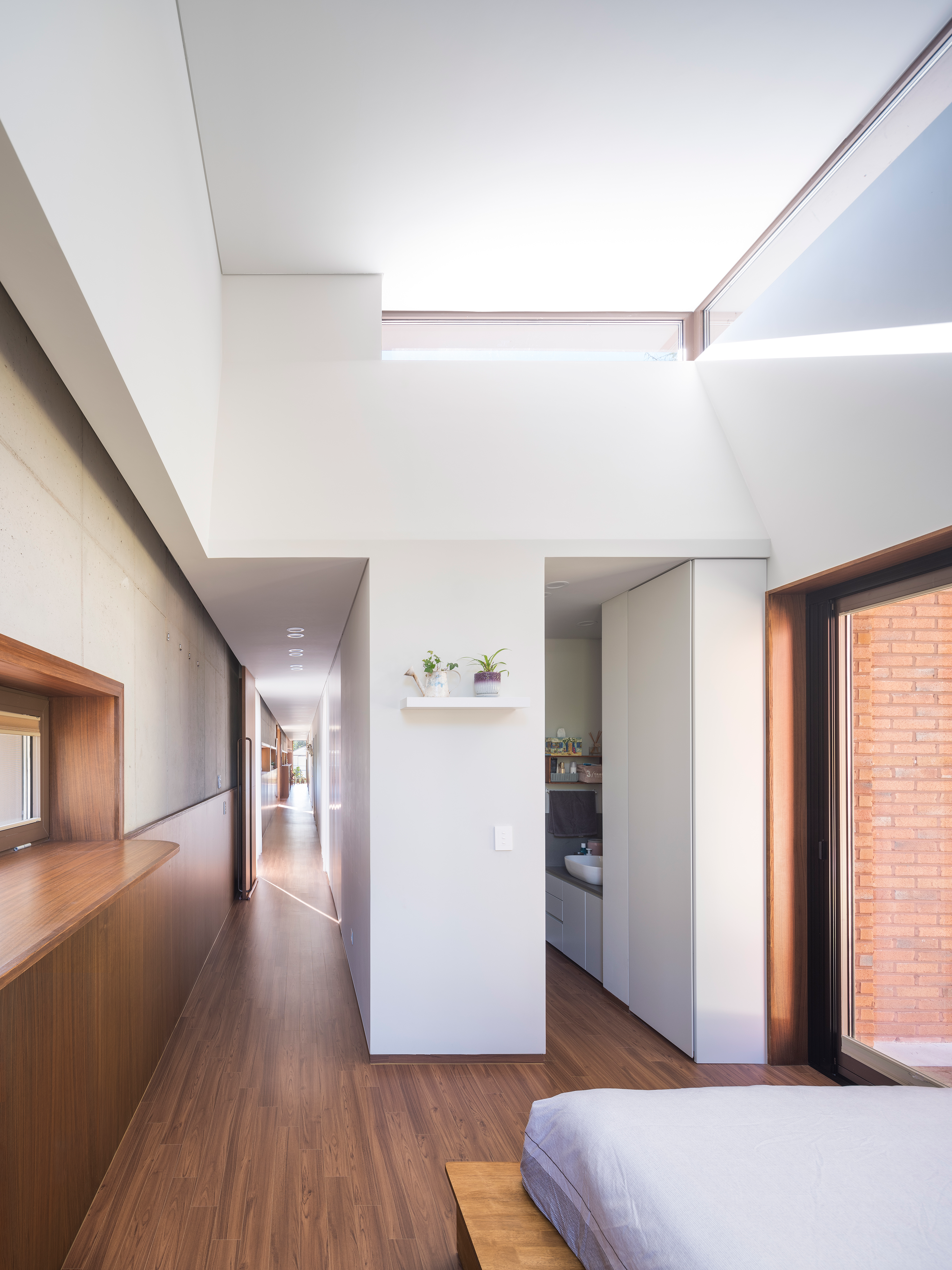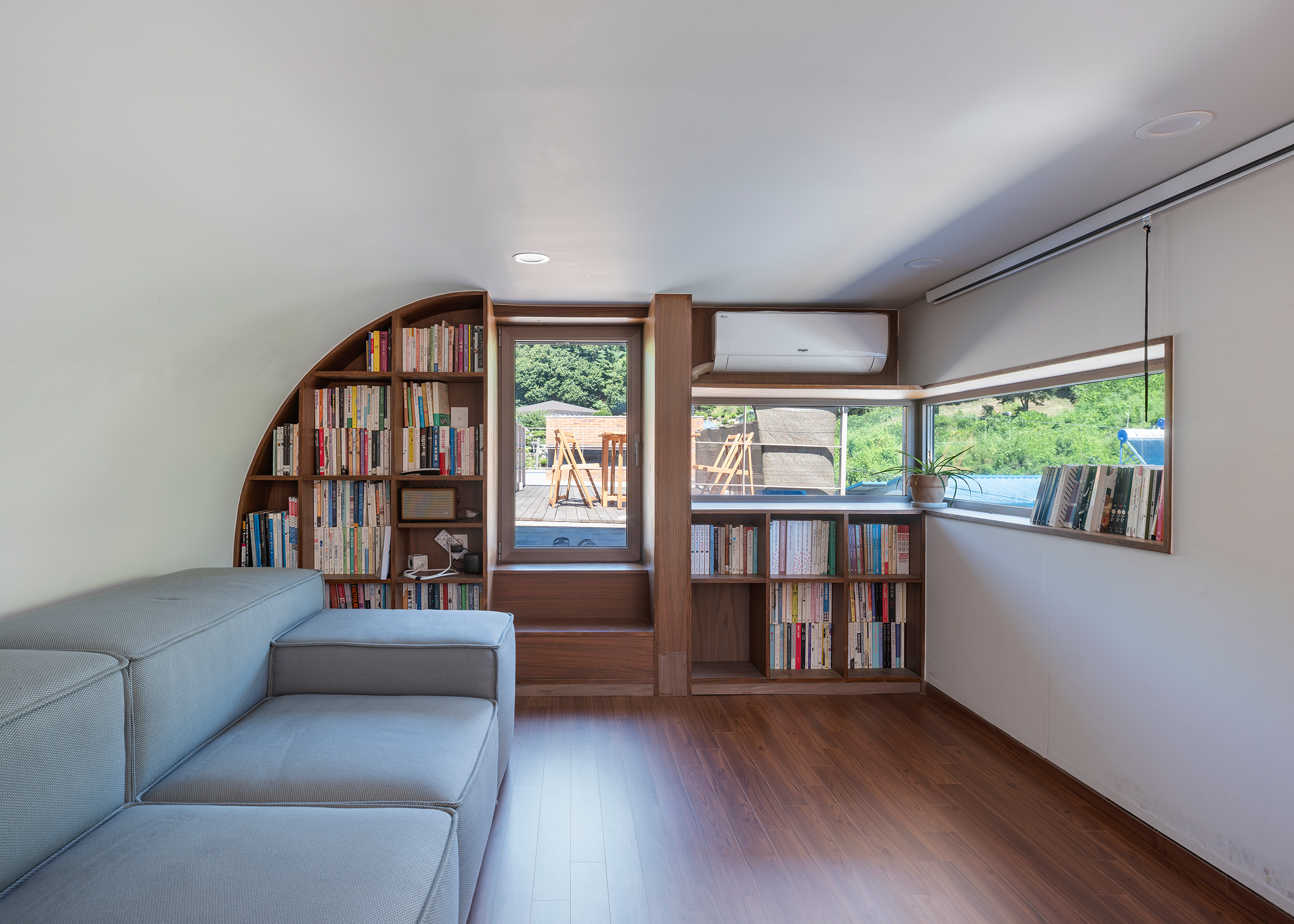현관에 서면 큰 창 너머 마을길과 풍경을 보게 된다. 가로막은 줄 알았던 긴 집을 끊고 늘려 틈을 만들었다. 안과 밖의 풍경이 그 사이를 관통한다. 편안한 현관을 지나 좌우로 30미터 이상의 복도를 처음 만나게 된다. 독립적인 각 방과 중정을 만나게 해주는 공간이자, 책을 두는 서가이며, 그림을 걸어두는 갤러리이다. 긴 창으로 마을 길 풍경을 바라면서 책을 읽고 글을 적기도 하므로 복도라기보다 ‘길’이라 부르면 좋겠다.