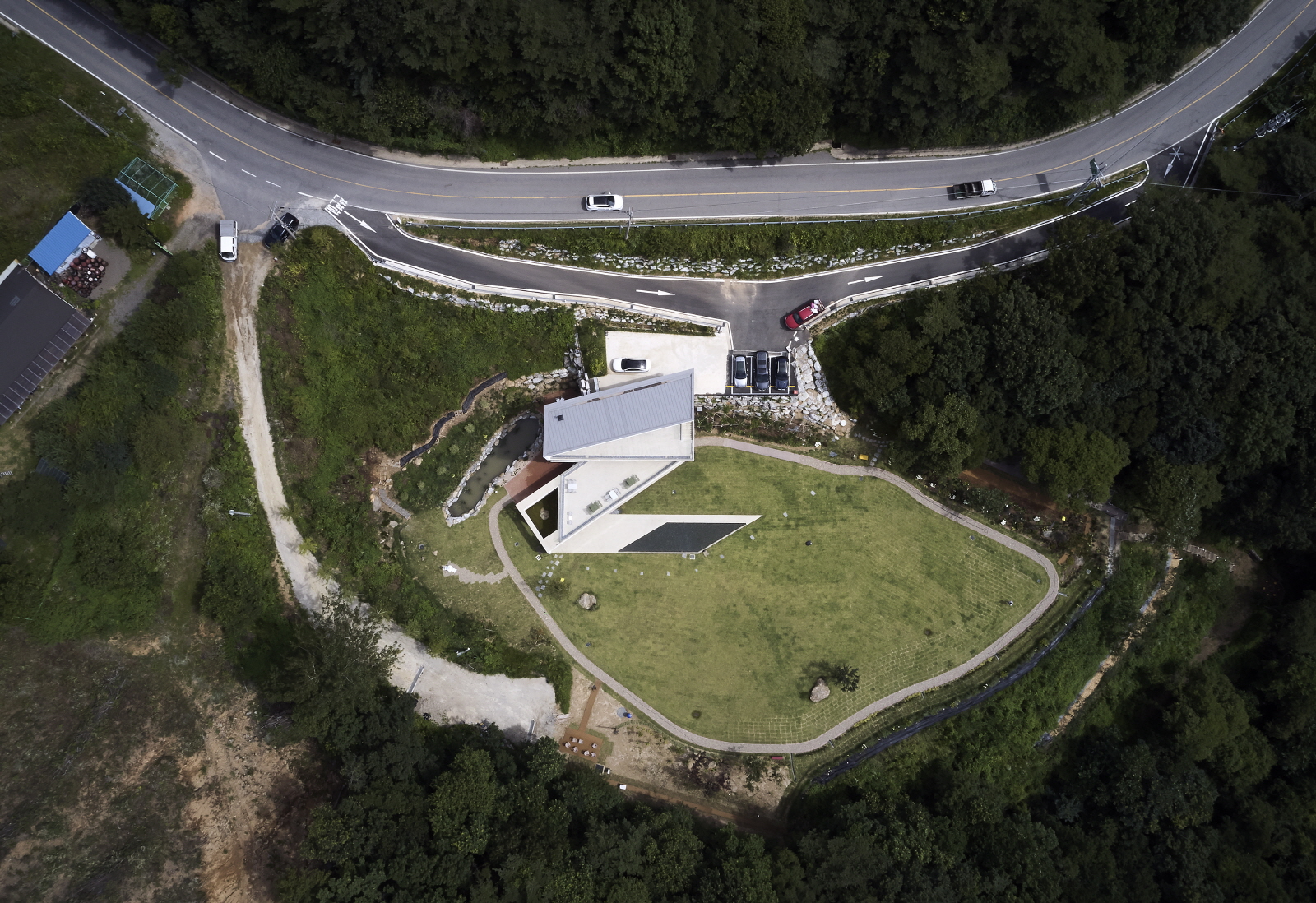 언덕을 배경으로 펼쳐진 대지의 형상은 병풍처럼 둘러싸고 있는 주변 숲, 남쪽 산자락 사이로 보이는 열린 하늘과 진천의 모습을 담아내고 있다. 최대한 부지를 훼손하지 않으면서 대지 레벨을 활용하여 자연스럽게 얹힌 매스의 모양은 건축사의 땅에 대한 고심을 보여준다.