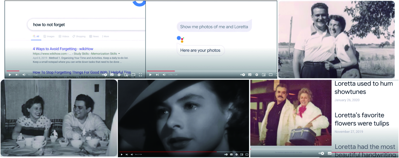 이어서 주인공인 할아버지가 스마트 스피커를 통해 아내인 로레타와 자신이 함께 찍은 사진을 보여 달라고 구글 어시스턴트(Google Assistant)에 요청한다. ‘여기 당신의 사진이 있다’는 자막과 부부의 사진 두 장이 모니터에 나타난다. 그 사진에서 콧수염을 기른 자신의 모습을 본 할아버지는 허허 웃으며 “로레타가 내 콧수염을 싫어했다는 것을 기억해”달라고 요구한다. 이 명령을 들은 구글 어시스턴트는 기억하겠다고 답변한다.