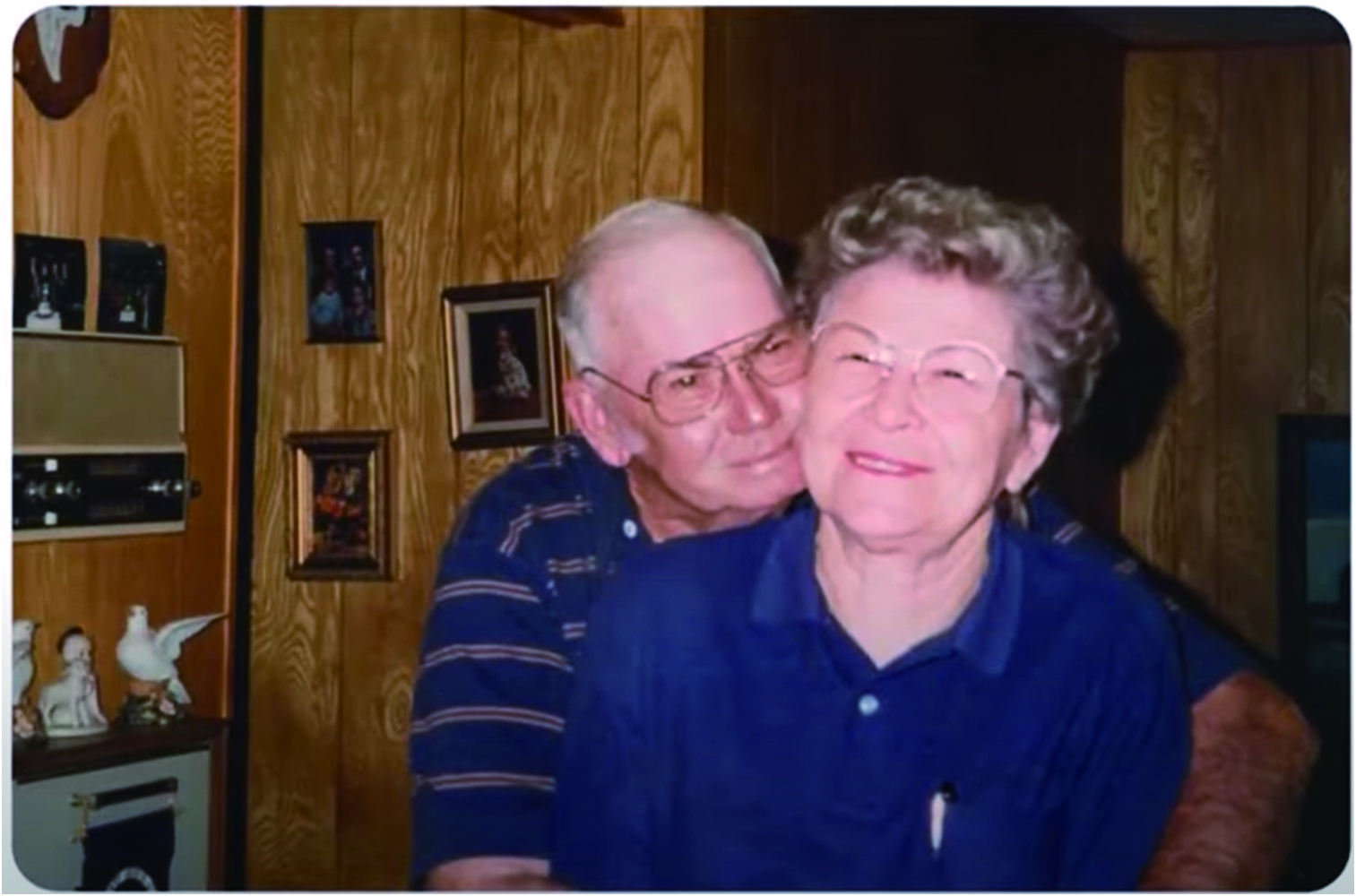 #부부의 사진 두 장이 모니터에 나타난다. 사진 한 장 속의 남편은 콧수염을 기르고 있다.