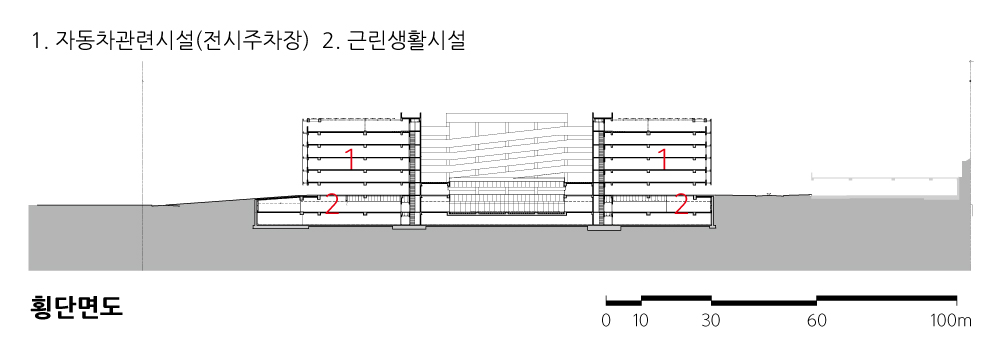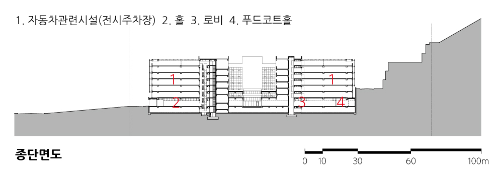 지하 3층부터 지상 4층, 그리고 지붕층에 이르기까지 건축물 전체를 관통하는 ‘원형 구조’는 오토아레나의 내부 동선 계획의 핵심이자 외관 디자인을 결정하는 주요 요소이다.