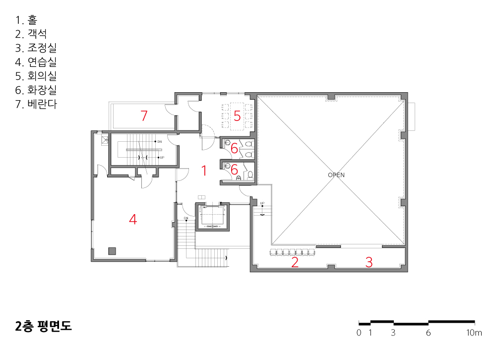 마주하며 호흡하는 공간, 연극은 시간과 관객을 담아내는 예술 활동이다. 건축 역시도 장소와 일상 그리고 시간 속에서 마주하는 것들이 스며들기를 바라며, 건축의 질감도 연극의 질감을 닮았으면 했다. 다양한 미장센으로 과장되지 않은 시간의 흐름만이 건축의 특수효과를 만들어내는 일상적 질감의 건축을 위해 노출콘크리트의 물성을 사용하여 장소의 매 순간을 담아내고자 했다.