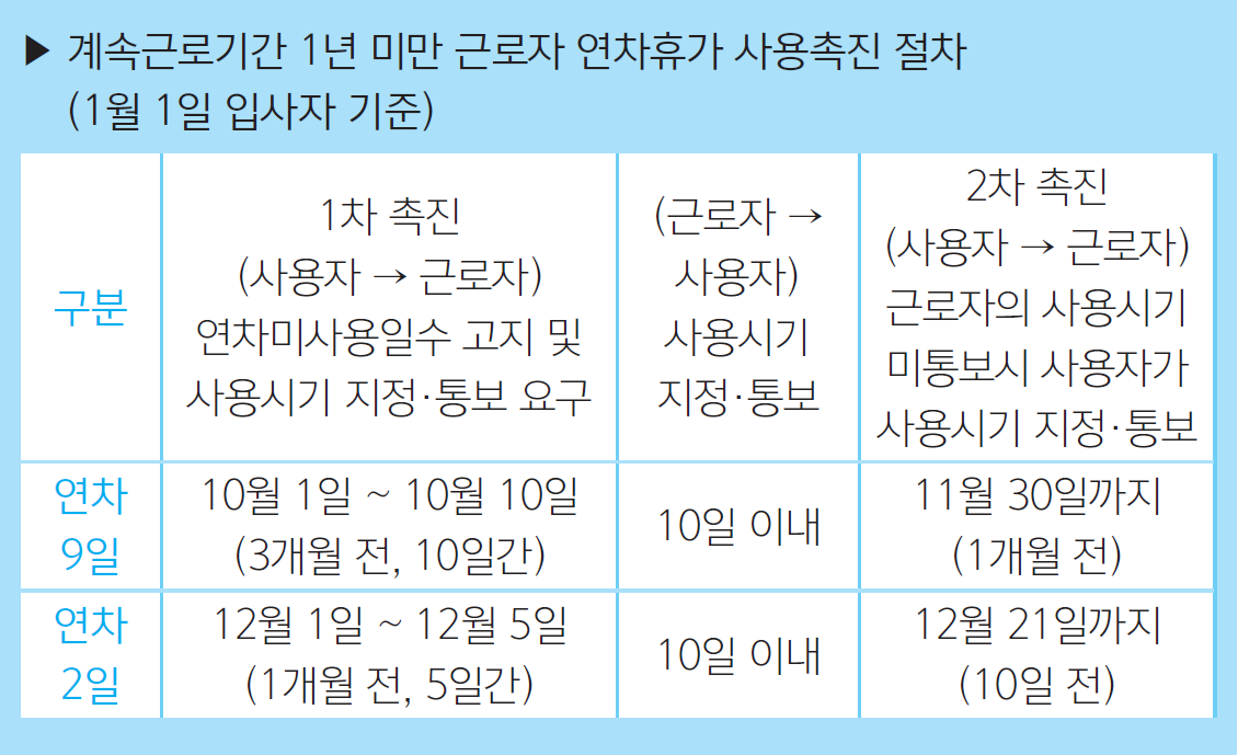 ※ 먼저 발생한 연차휴가 9일과 이후 발생한 연차휴가 2일의 사용촉진 시기가 다름에 유의