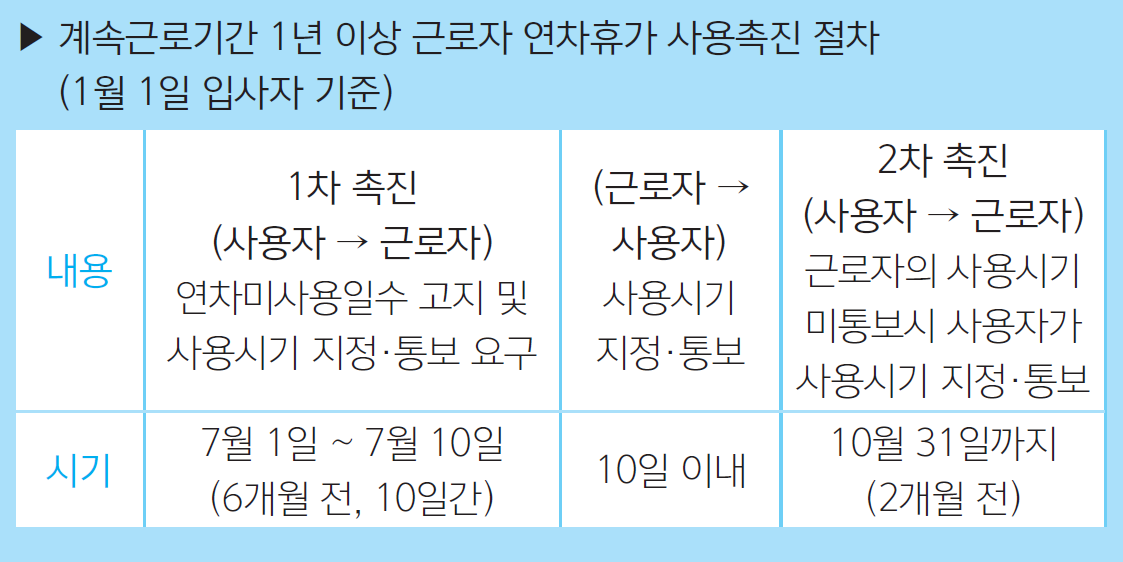 입사일로부터 1년의 근로기간이 끝나기 3개월 전부터 10일 이내(이후 발생한 연차휴가 2일은 1개월 전부터 5일 이내) 근로자별로 사용하지 아니한 연차휴가일수를 알려주면서, 근로자가 촉구일로부터 10일 이내에 사용하지 아니한 연차휴가의 사용시기를 정하여 사용자에게 통보하도록 서면으로 촉구해야 한다.