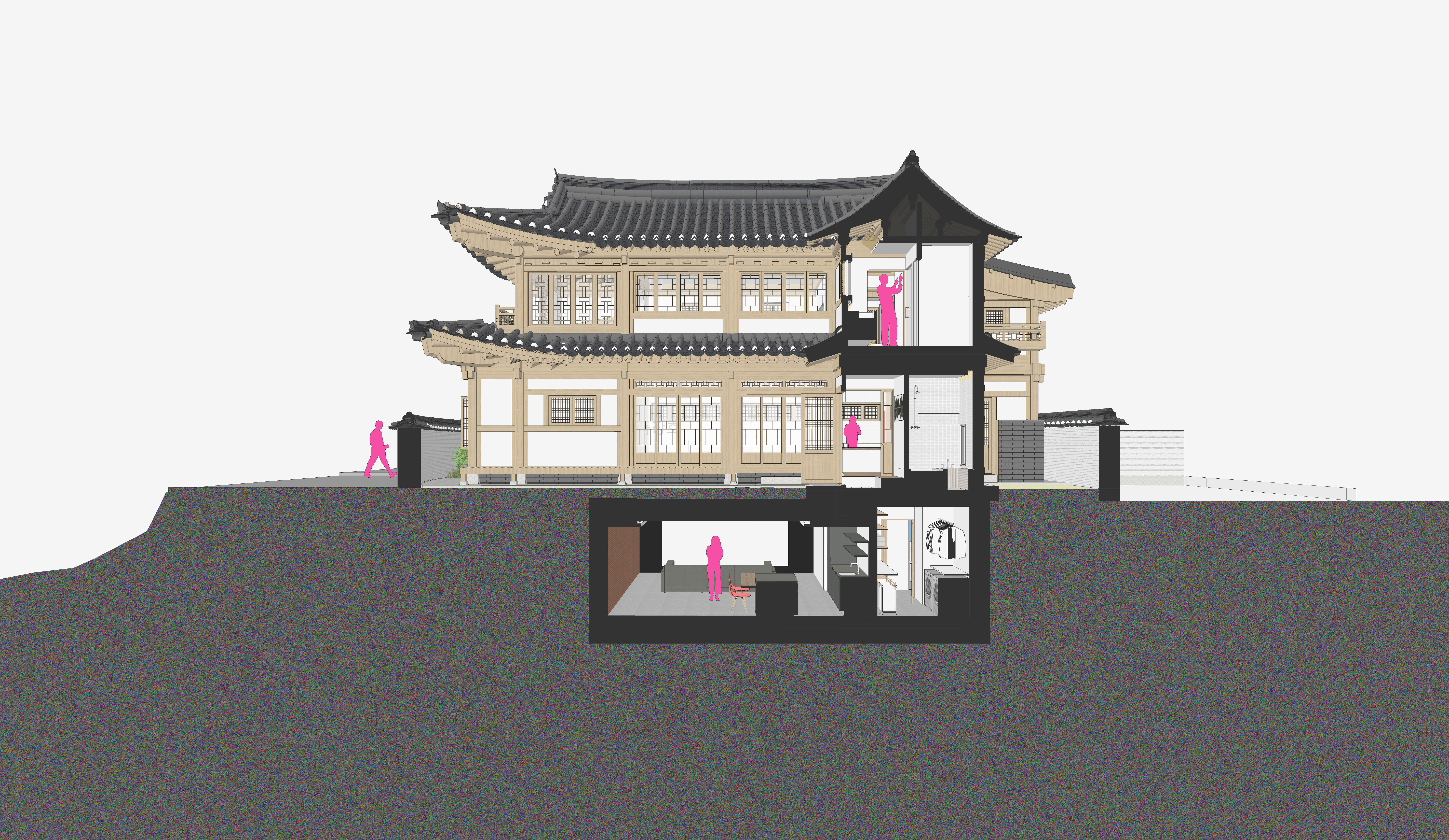연면적 약 264제곱미터, 80평 남짓한 지하 1층, 지상 2층의 한옥이다. 집은 처음부터 한옥숙박업을 하고자 계획되었다. 1층은 두 채의 객실이 있다. 각각은 침실, 화장실, 그리고 작은 마당과 마루가 한 세트로 구성된다. 2층은 집주인이 생활하는 공간이며, 지하는 손님과 집주인을 위한 다목적 공간이다. 그리고 숙박 관련 서비스를 도와줄 설비인 덤웨이터를 설치했다. 한옥치고는 단일 필지와 단일 건축물로서 꽤 높은 용적률과 밀도로 계획했다. 서울 시내 비싼 토지 가격과 건축비를 고려한다면 높은 용적률은 한옥이 고밀도 도시 공간에서 살아남을 수 있는 제일 중요한 현실적 조건이라고 믿었기 때문이다.