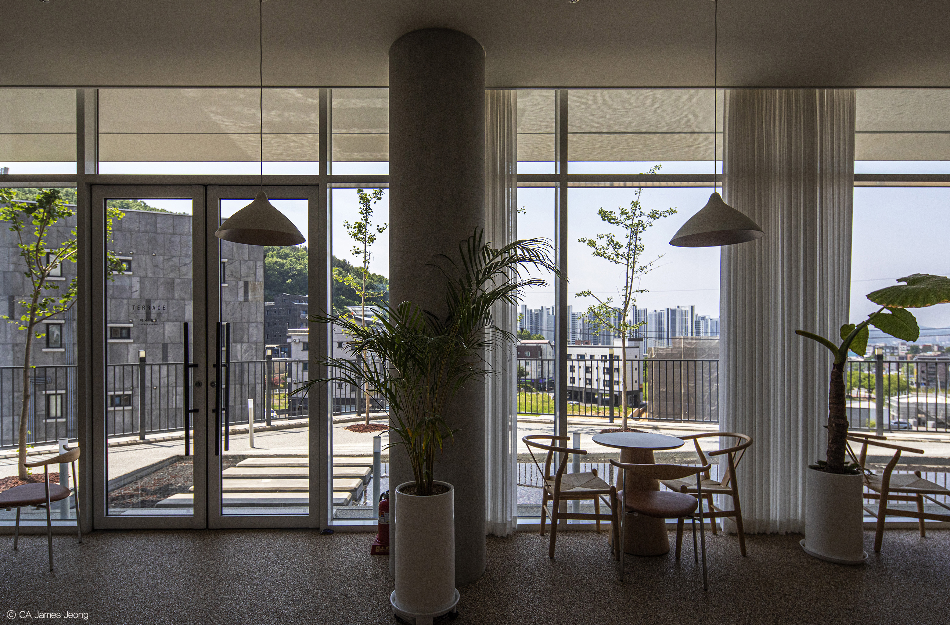 The south side is planned with transparent glass so that the surrounding shapes that are seen as silhouettes by the depth of a focus difference coexist with the artificial set and create a synergistic, and the colors and shapes of nature and city that are projected far away can also be used as a faint background.
