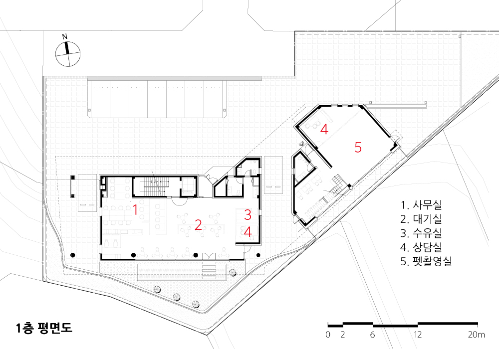 The main shooting space and the pet shooting space are separated in principle, but a bridge-type connection passage that shares the external terrace on the second floor is constructed for the effect of spatial transition. The shooting space on the third floor is planned so that the ceiling line disappears in the frame due to the eaves lifted toward the sky and the internal space can be continuously expanded.