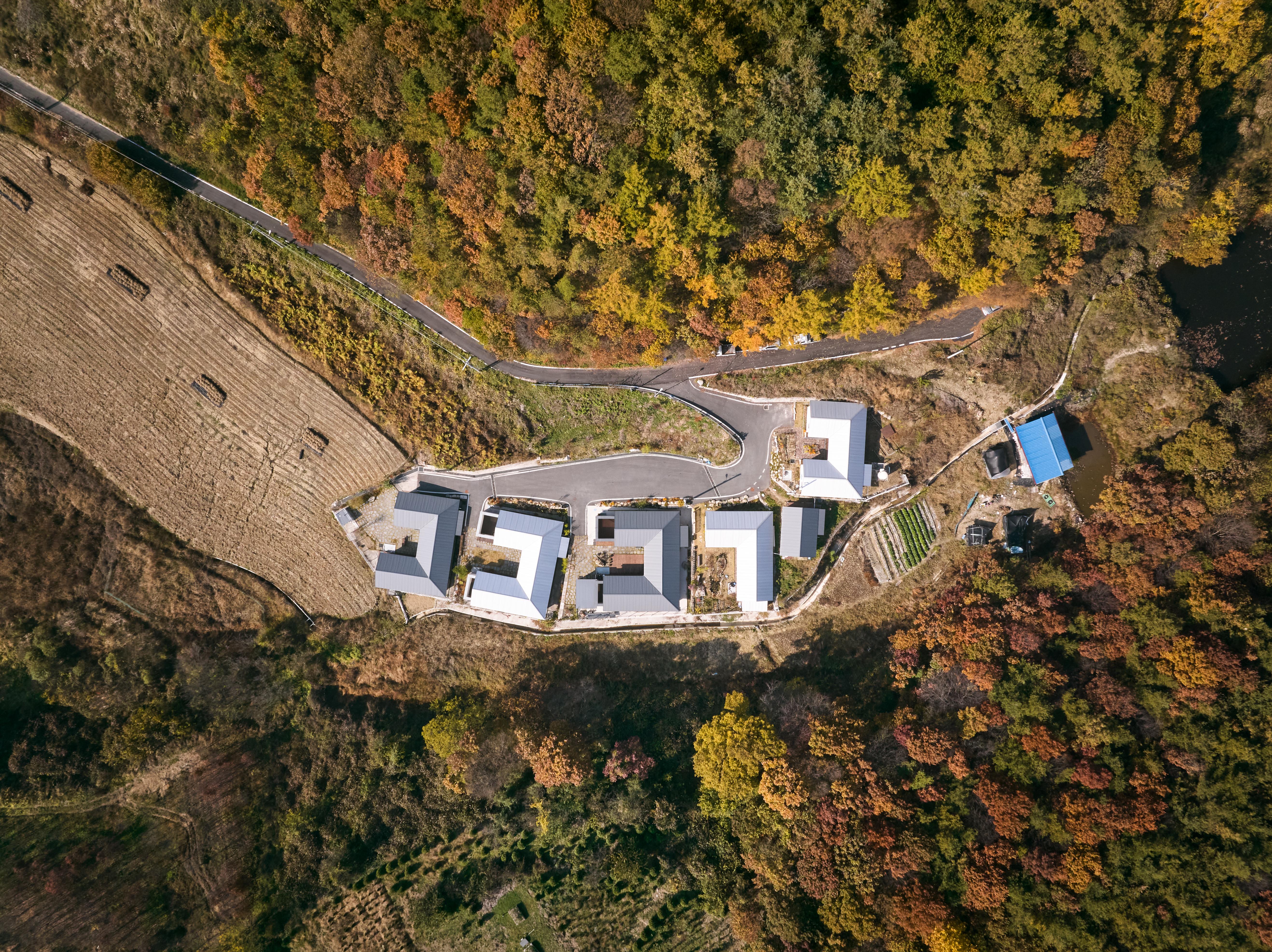 Not just one, but six houses. Homes located in rural areas, not in the city center. Six different homeowners. We visited the site with only basic information. The surrounding farmhouses they observed on the land were solely focused on functionality, lacking in experiencing the ever-changing natural landscape from inside the house. The floor plans were similar to typical apartment layouts rather than the familiar single-house style with front and back yards, which they had experienced in their childhood. The characteristics of the neighboring farmhouses became important starting points for the design. The six homeowners are individuals with different lives, brought together by their common desire to return to rural Jinan, Jeollabuk-do. They decided to live together in close proximity and commissioned the design. They wanted a complex-style detached housing consisting of three units with approximately 99.2 square meters (30 pyeong), one unit with 82.6 square meters (25 pyeong), one unit with 72.7 square meters (22 pyeong), and one unit with 26.4 square meters (8 pyeong). They wanted each house to have a distinct scale, resembling a small village, with spaces for neighborly communication while ensuring privacy.