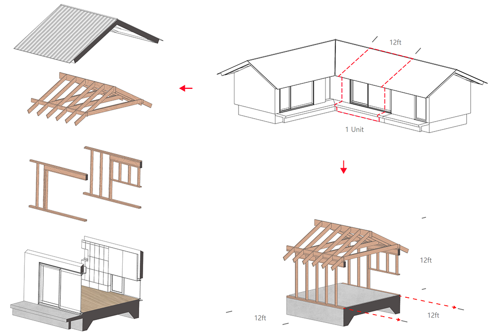 The chosen approach is to plan the basic unit module (12x12x12 feet) and expand it according to the requirements of the six households. The design of the basic unit module takes into consideration the specifications of timber structural elements, rational living space dimensions, and the variation in ground levels.