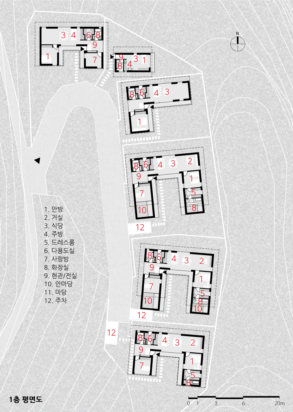 한 채가 아닌 여섯 채. 도심이 아닌 농촌에 자리 잡을 집. 여섯 명의 건축주. 기초적인 정보만을 가진 채로 대지를 답사했다. 대지에 방문해 살펴본 주변 농가 주택들은 온전히 기능에만 충실한 내부 지향적인 모습이었다. 마당이라는 훌륭한 공간은 있지만 사계절 변하는 자연경관을 집안에서 느끼기에 부족해 보였다. 평면 또한 어릴 적 경험했던 시골집의 앞마당, 뒷마당과 바로 연계되는 홑집형태가 아닌 흔한 아파트 평면과 다를 바 없는 겹집 형태였다. 주변 농가주택이 가지고 있는 특징들은 설계의 시작점에서 중요한 요소였다. 건축주 여섯 가구는 각자 서로 다른 삶을 살다 전북 진안에서 귀농이라는 고리로 엮인 사람들이다. 떨어져 살다가 가까이 모여 공동생활을 하기로 결심하고 설계를 의뢰했다. 여섯 가구는 약 99.2제곱미터(30평) 세 채, 82.6제곱미터(25평) 한 채, 72.7제곱미터(22평) 한 채, 26.4제곱미터(8평) 한 채로 이뤄진 단지형 단독주택을 원했다. 각기 다른 규모의 집이 한마을처럼 보이고, 이웃 간에 소통하는 공간을 가지는 동시에 프라이버시도 보호해야 했다.