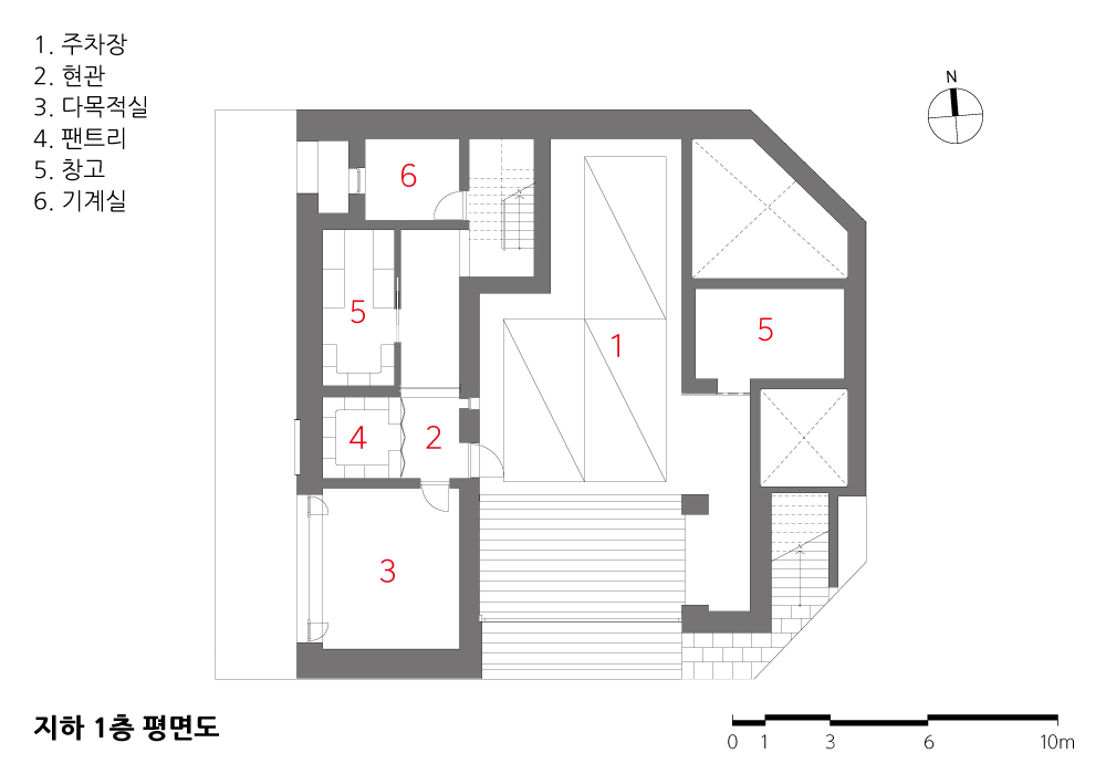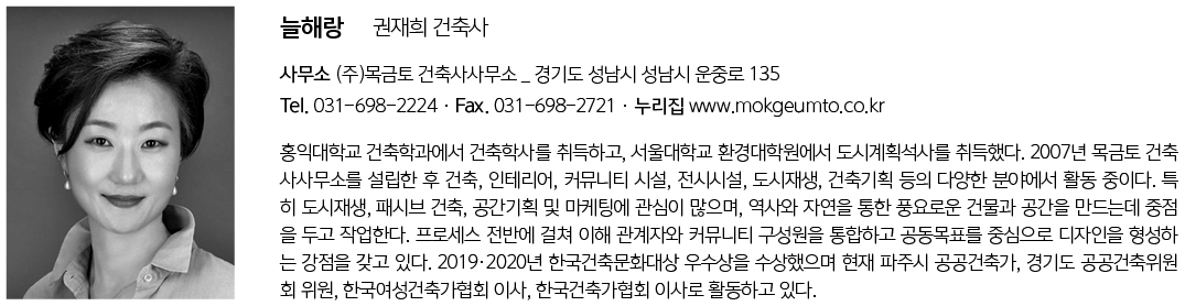 | 늘해랑 설계자 | 권재희 _ (주)목금토 건축사사무소 건축주 | 강호창, 전유진 시공사 | 호산건설(주) 대지위치 | 경기도 성남시 분당구 운중동 주요용도 | 단독주택 대지면적 | 338.50㎡ 건축면적 | 166.43㎡ 연면적 | 443.15㎡ 건폐율 | 49.17% 용적률 | 68.14% 규모 | B1F - 2F 구조 | 철근콘크리트구조 외부마감재 | T30 사비석 내부마감재 | 석고보드 위 수성페인트도장 설계기간 | 2021. 02 - 2021. 08 공사기간 | 2021. 09 - 2022. 08 사진 | 박영채 구조분야 | 건축구조연구소 다우 기계설비분야 | (주)한길엔지니어링 전기분야 | (주)한길엔지니어링 |