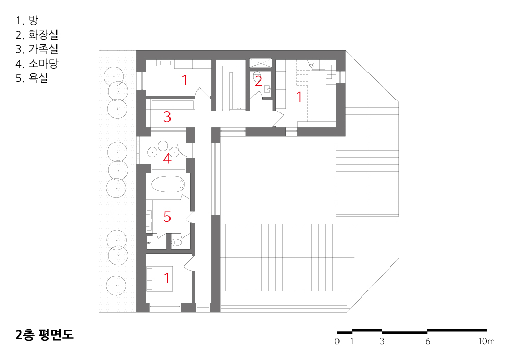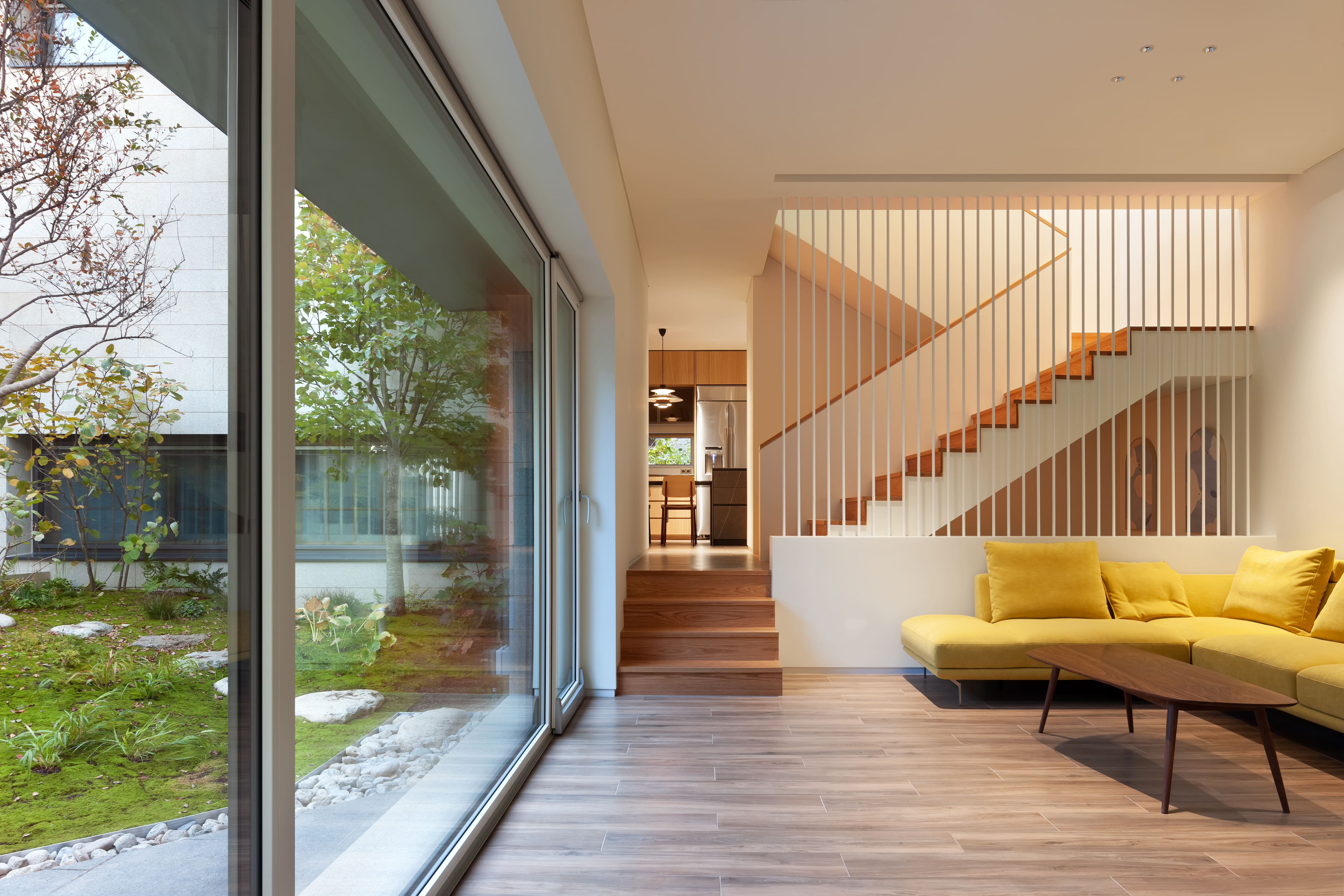 또한 집안에서 머무는 시간이 부쩍 많아진 디지털 시대의 건물 곳곳에 소정원들을 배치시켜 채광, 녹음, 통풍의 역할 외에 공간마다 다른 농도의 빛이 머금도록 계획했다. 소정원이 집안에 끌어들이는 다른 느낌의 빛은 이 집을 풍요롭게 만드는 중요한 요소이다. 2층의 가족이 공용으로 사용하는 가족 욕실은 위생이라는 기본 역할에 충실하면서도 휴식과 치유의 공간이 되도록 자연을 풍부히 끌어들였다.