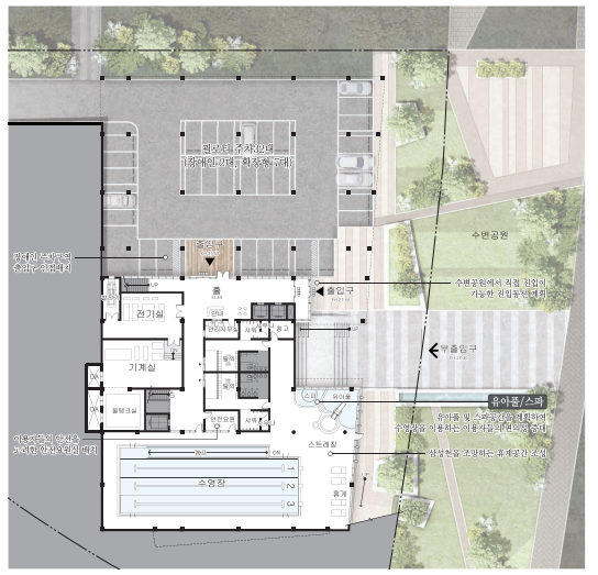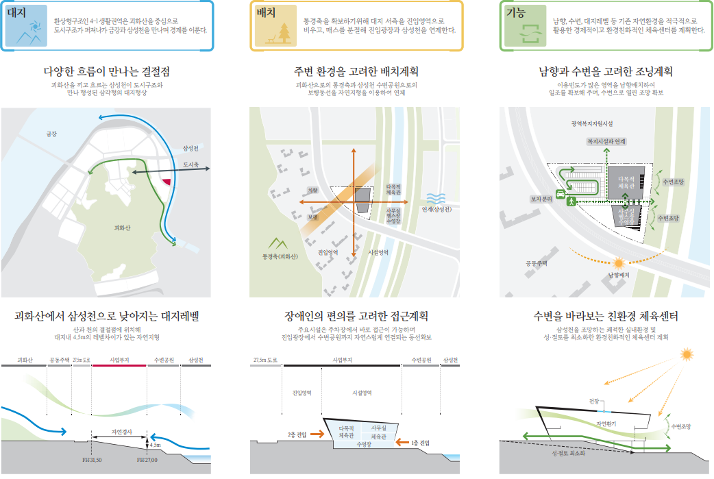 괴화산 통경축을 기준으로 서측 진입 영역과 동측 시설영역으로 구분하며 전면 도로에서의 자연스러 운 접근과 북측 광역복지지원센터(예정)과의 원활한 연계를 계획했다. 대지내 4.5미터 레벨차를 활용하 여 전면도로와 수변공원에서 1층 및 2층으로 장애인의 보행동선 및 피난동선을 확보하며 진입광장의 사 잇길을 중심으로 주 이용시설인 체육관과 헬스장을 마주보게 배치하여 사용자의 이용편의성을 높였다.