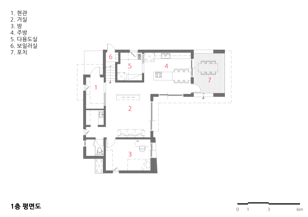 우선 내부공간은 합치고 창문을 크게 내어 개방감을 확보하는 방식이 아닌 공간을 나누어 다양 한 공간을 만드는 방식을 택했다. 공간마다 변화가 있고 같은 면적의 방도 창문의 크기와 위치 가 달라 다른 풍경을 끌어들인다. 앞마당과 뒷마당, 포치와 테라스는 다양한 외부공간을 만들어 하나의 큰 정원보다 더 많은 형태를 담을 수 있다. 입면은 박공지붕과 외경사지붕, 작은 평지붕 으로 구성된 3개의 매스를 결합시켜 보는 각도에 따라 다양한 표정을 만들어 낸다. 가족은 내외 부의 다양한 공간을 느낄 수 있는 단독주택에서 풍성한 삶을 살아간다.