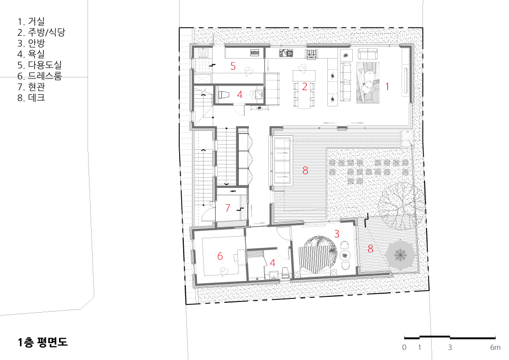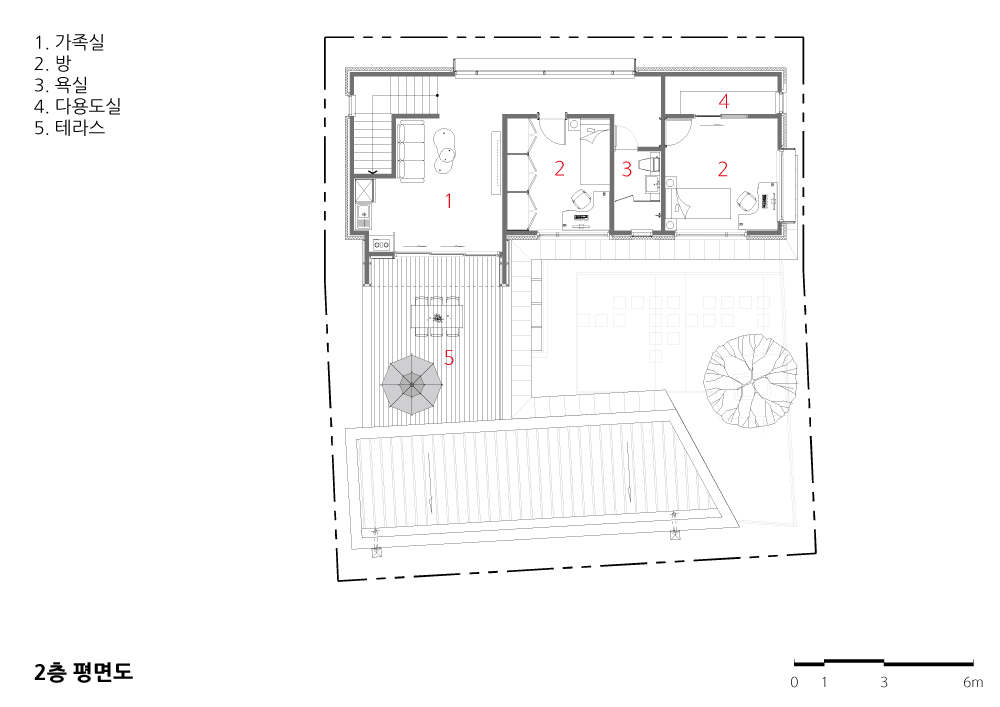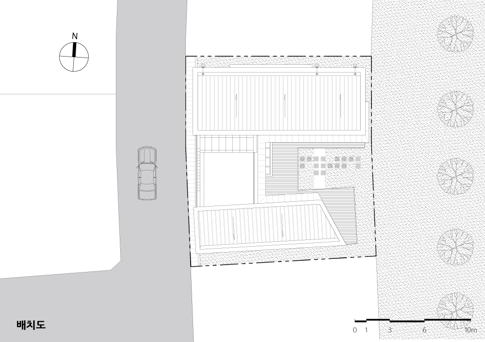 동쪽의 근린공원 쪽으로 거실과 주방이 있는 공용공간과 안방공간으로 구성된 별채 사이로 중 정형의 아늑한 마당을 가진 배치를 계획했다.